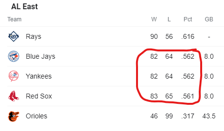 Red Sox won yesterday, but so did the Yankees and Blue Jays so no one picked up any ground in the race for the two wild card spots.