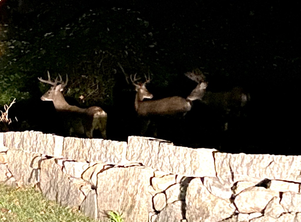 Like the saying goes, “Like a deer in headlights.” Although, I think these guys surprised me more than I surprised them. I wish I could have taken a better photo. Not only do I not get great photos in the dark with my phone, but I also didn’t want to frighten them away. While there are only three in the picture, there were at least five or six of them hanging out together.