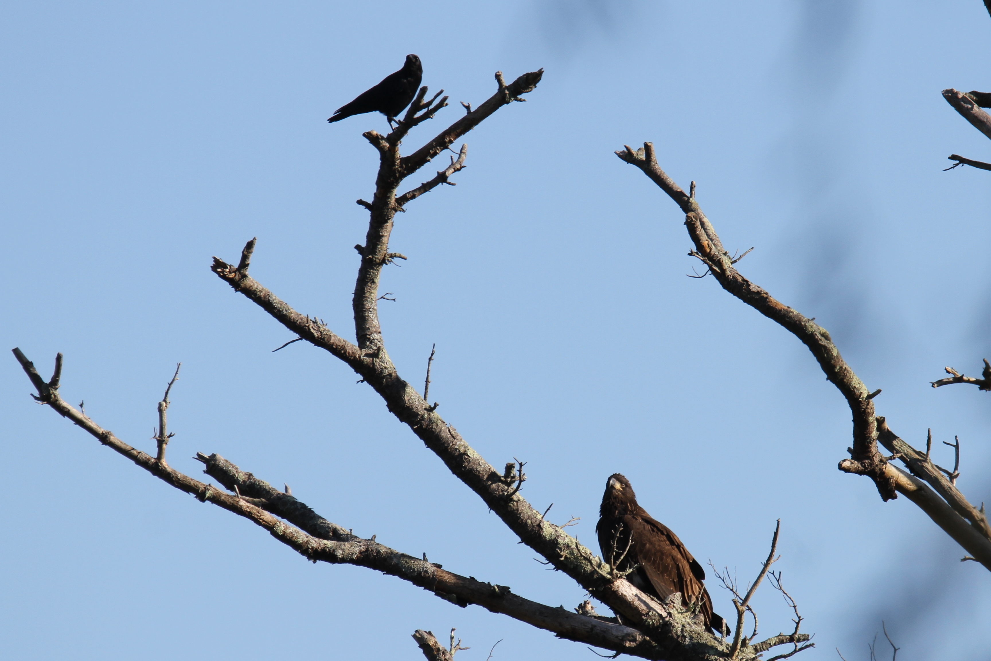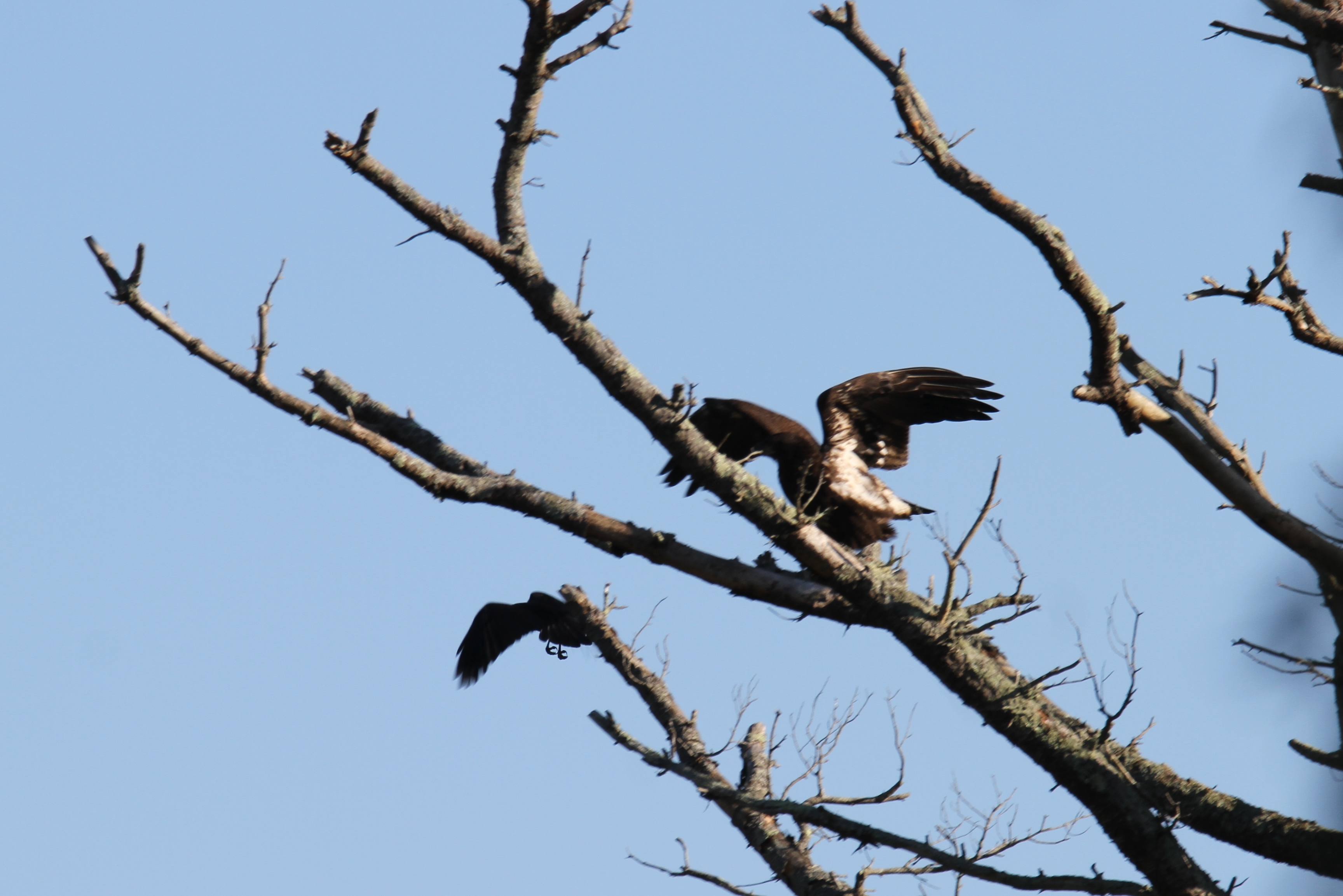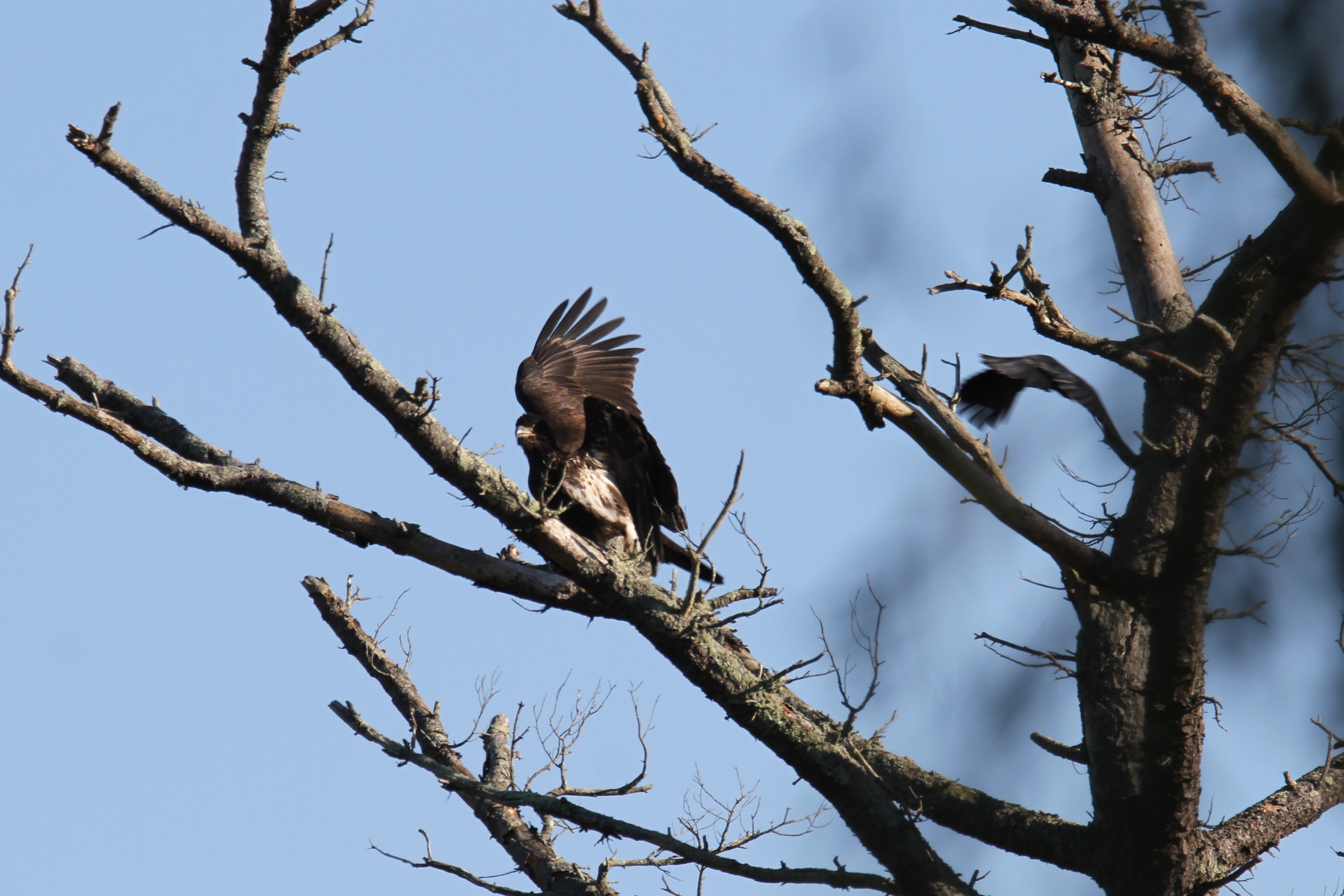 I was surprised to see a large bird in the “resting tree” behind our apartment as we haven’t seen too many larger birds recently. But I knew right away from its size, appearance and behavior that it is likely a young eagle. I am very excited to see young eagles hanging around this area! Young eagles in the area often means there are adults around too though I did not see any this time. As is usual, the crows were not happy and felt the need to harass the young eagle, which it seemed to mostly take in stride. I hope it returns soon.