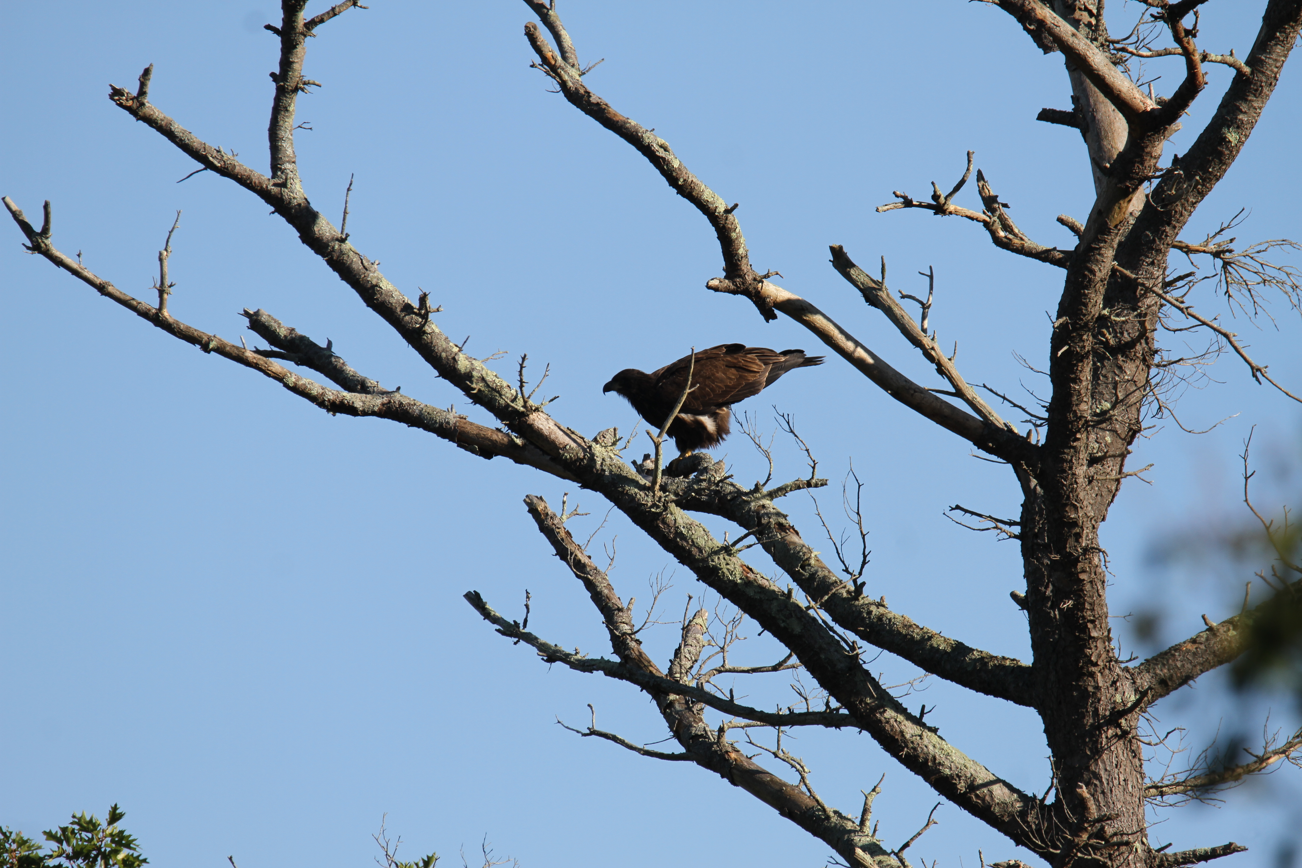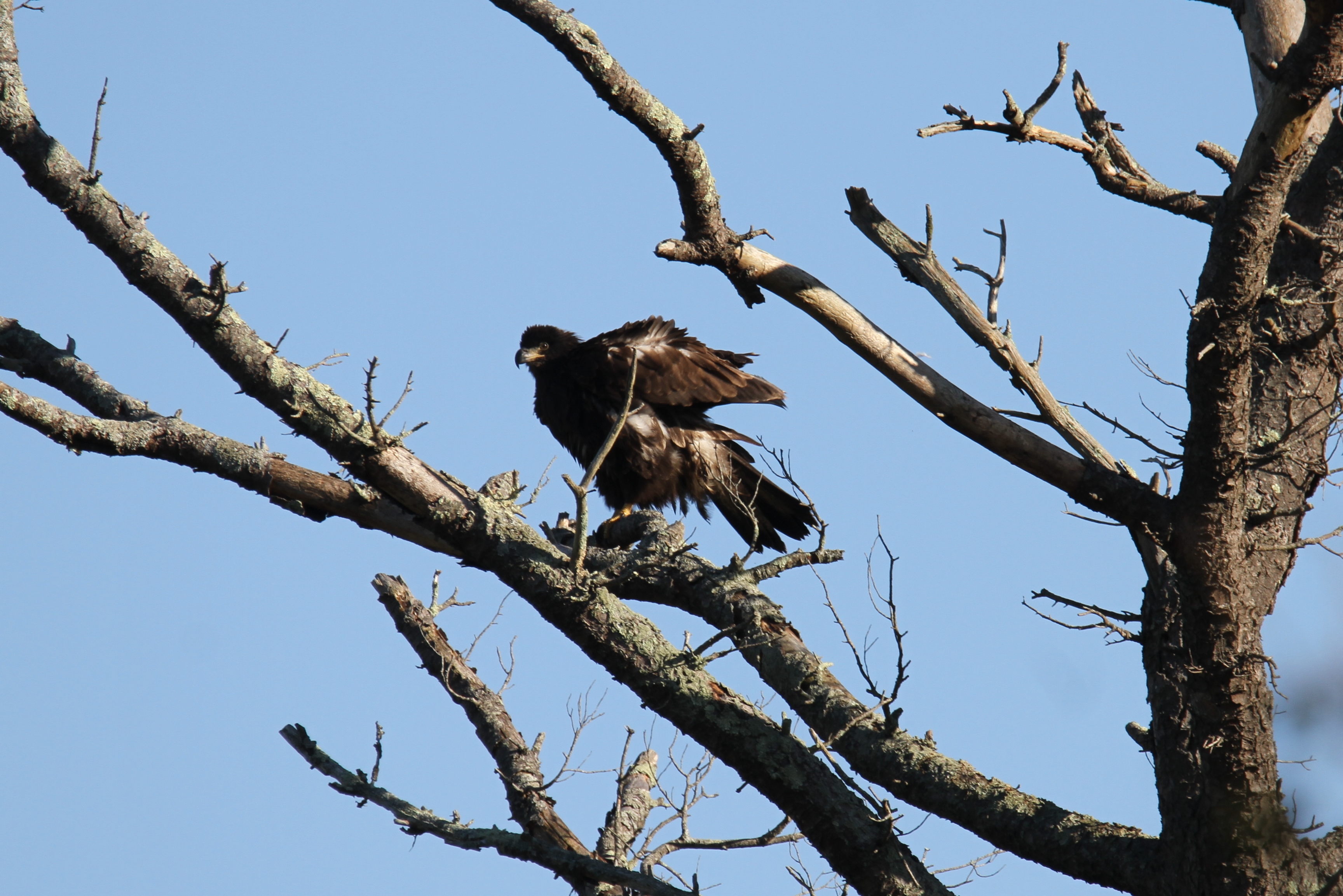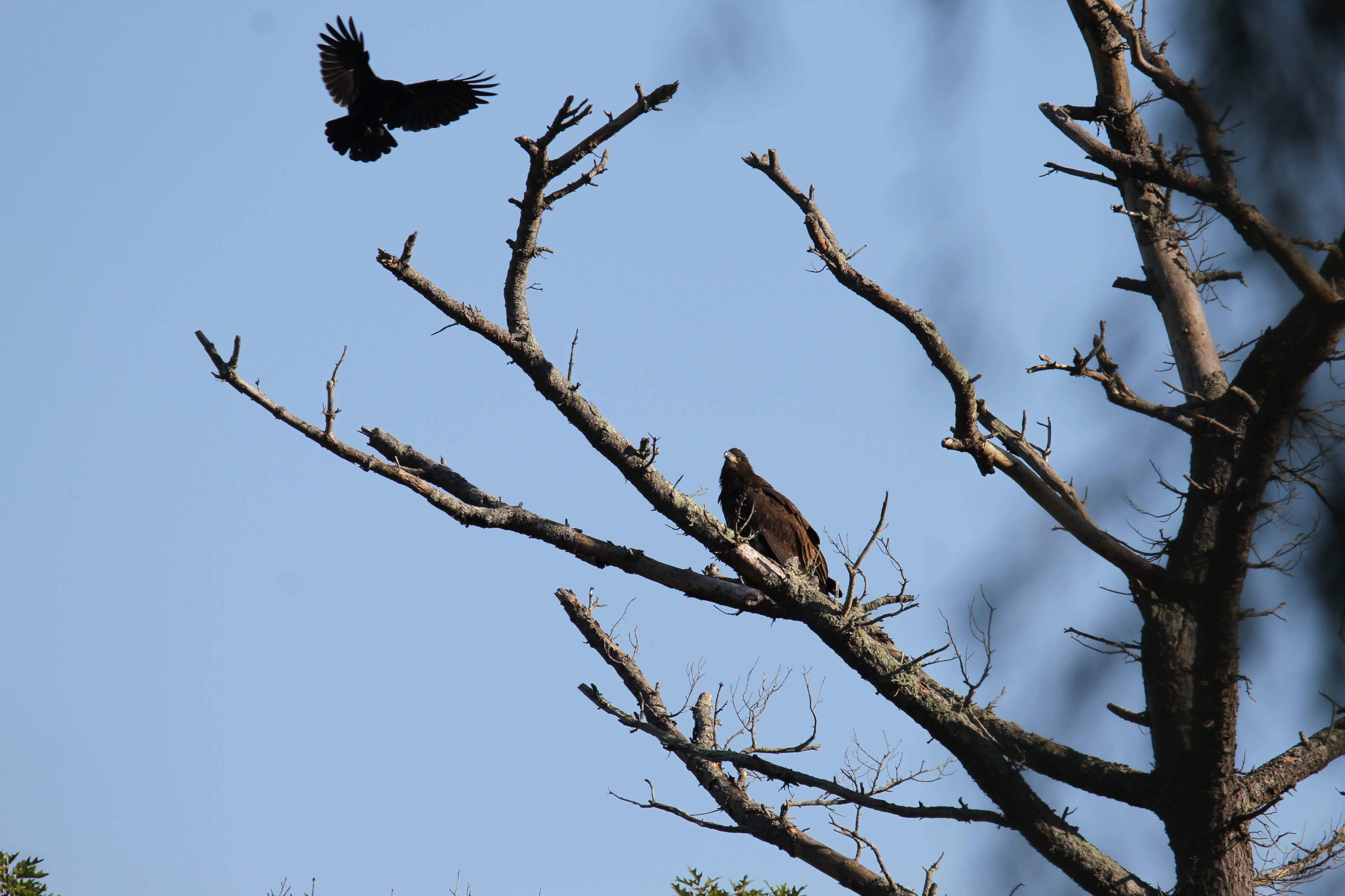 I was surprised to see a large bird in the “resting tree” behind our apartment as we haven’t seen too many larger birds recently. But I knew right away from its size, appearance and behavior that it is likely a young eagle. I am very excited to see young eagles hanging around this area! Young eagles in the area often means there are adults around too though I did not see any this time. As is usual, the crows were not happy and felt the need to harass the young eagle, which it seemed to mostly take in stride. I hope it returns soon.