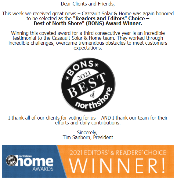 “Winning this award for 3 consecutive years just blows me away. The team worked extremely hard despite so many obstacles pertaining to the pandemic. And to win the Editor’s Choice award as well, shows that BONS recognizes the superior work that the team provides”- Tim Sanborn, Managing Partner of Cazeault Solar & Home- Tim Sanborn