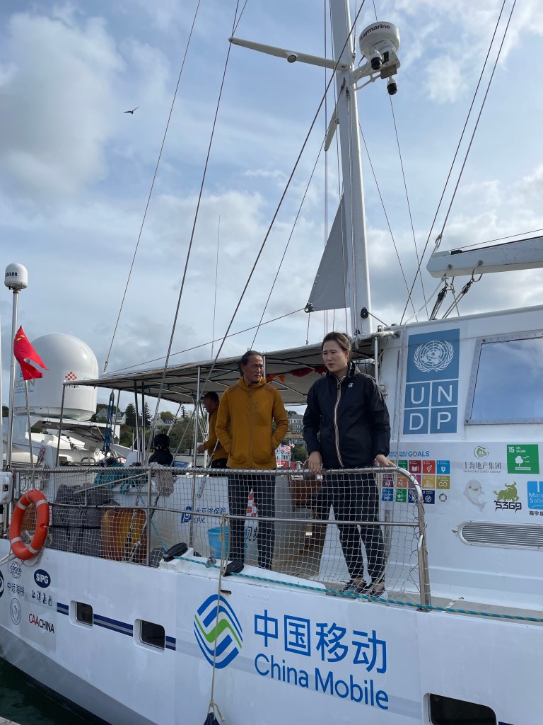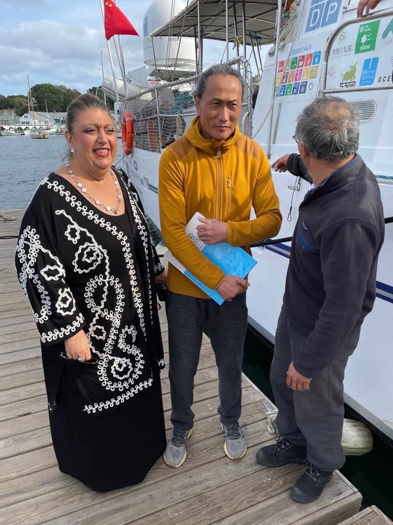 Ambassador Mayor greets crew members yesterday afternoon. Only one member (Korean) speaks little English. Other members are Chinese and Russian. Apparently film production company. Hit Gloucester via NW passage to North Pole. Engine difficulty forced into Mass. Waters and customs. ( big diesel outboards on approximately 80’ sailboat. ) Even with little English the group is charming and fun. I believe they broadcast from the vessel. I ran into vessel on my sunday stroll with Col. Ken Hruby. Thanks Joey. -John Bell