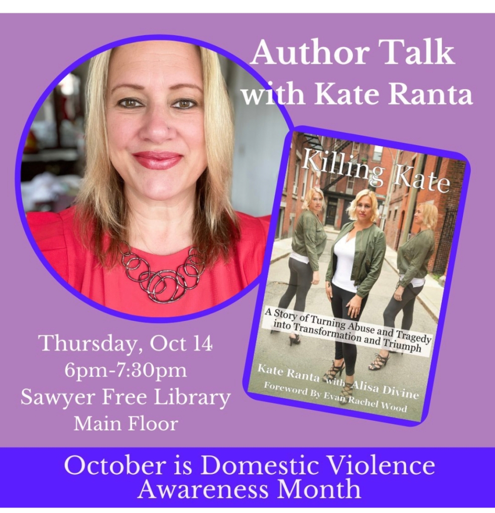 The Sawyer Free Library will present “Killing Kate: A Story of Turning Abuse and Tragedy into Transformation and Triumph,” Thursday, October 14, from 6:00 – 7:30 pm.