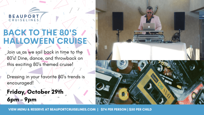 Enjoy our dinner buffet, dance to DJ Scottie Mac tunes, and throwback on this exciting 80’s themed Halloween Cruise!80’s attire is strongly encouraged!