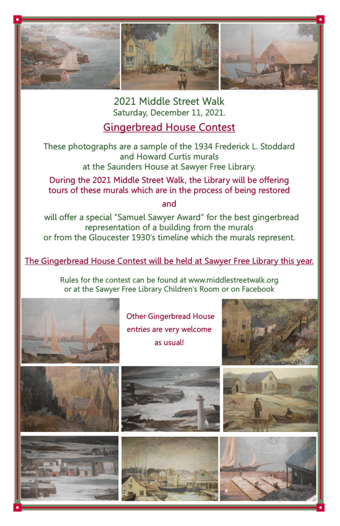 The Gingerbread House Contest will be held at the Sawyer Free Library, second floor.