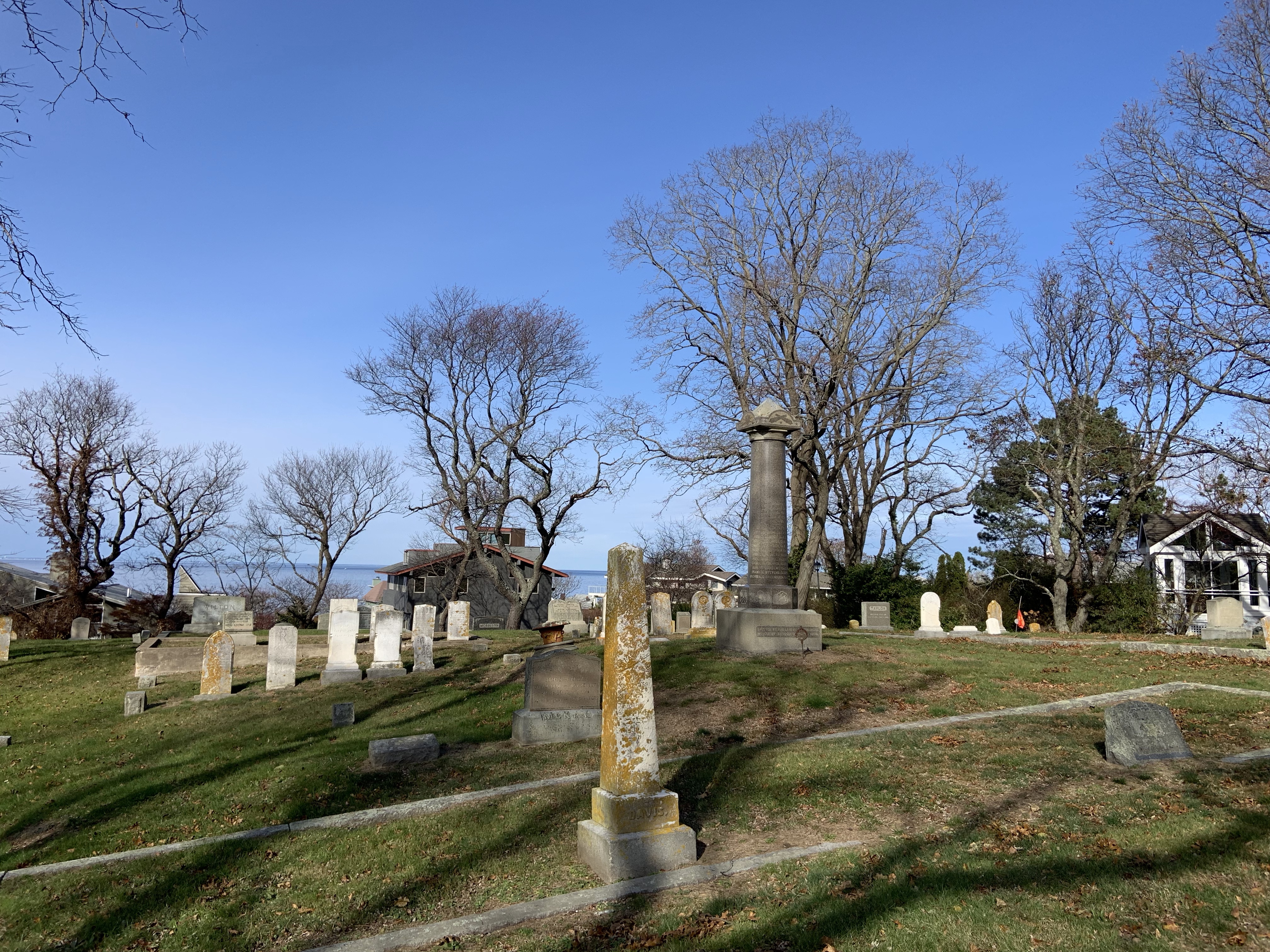 I follow a thread on Facebook that recently commented “No one takes pictures of cemeteries anymore”, and I thought “Please subscribe to the blog and follow my posts!” This is the Langsford Street Cemetery in Lanesville. It is a small, city owned, active cemetery roadside in Lanesville along 127. Most cemeteries are especially pretty in the fall, but this one has a special added bonus of looking out onto the water as well. It is very well kept and neatly arranged. There is an impressive monument to Civil War soldiers in the middle and a clear path down the center of the small area. The Guide to Cemeteries in Essex County, Massachusetts from the Essex Society of Genealogists notes the dates for this cemetery to be 1849-1959 though the City of Gloucester website lists it as active. It’s an easy stroll to view the various headstones in a quiet peaceful setting.
