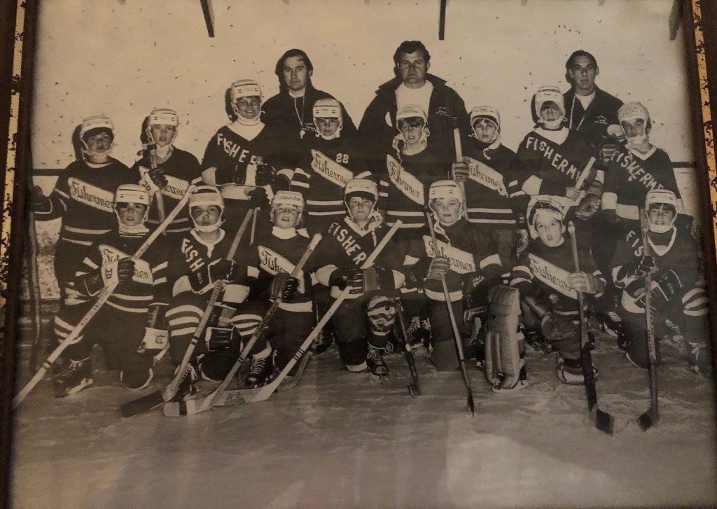 Jim Douglass recently sent me this photo. While I don’t recognize too many faces (please write in if you do!) I immediately got a good laugh at the absence of face shields, masks, or cages…..and the seemingly black eye/broken nose on the player in the front row second from the left. Old school hockey for sure. Their chin straps also look like our modern days masks.