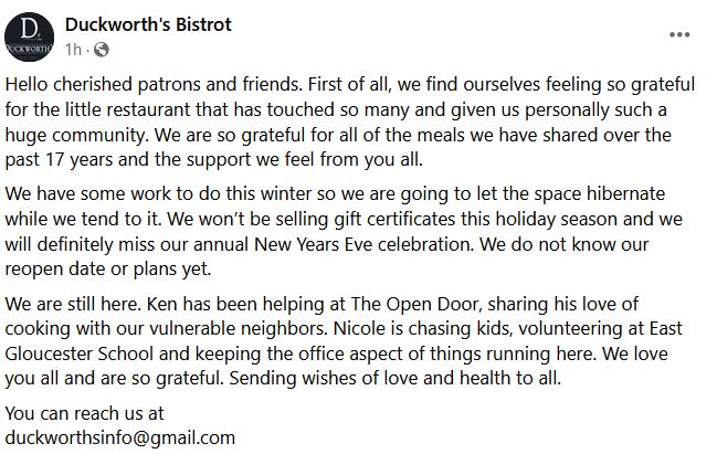 An update from Ken and Nicole at Duckworth’s Bistrot on Facebook today: