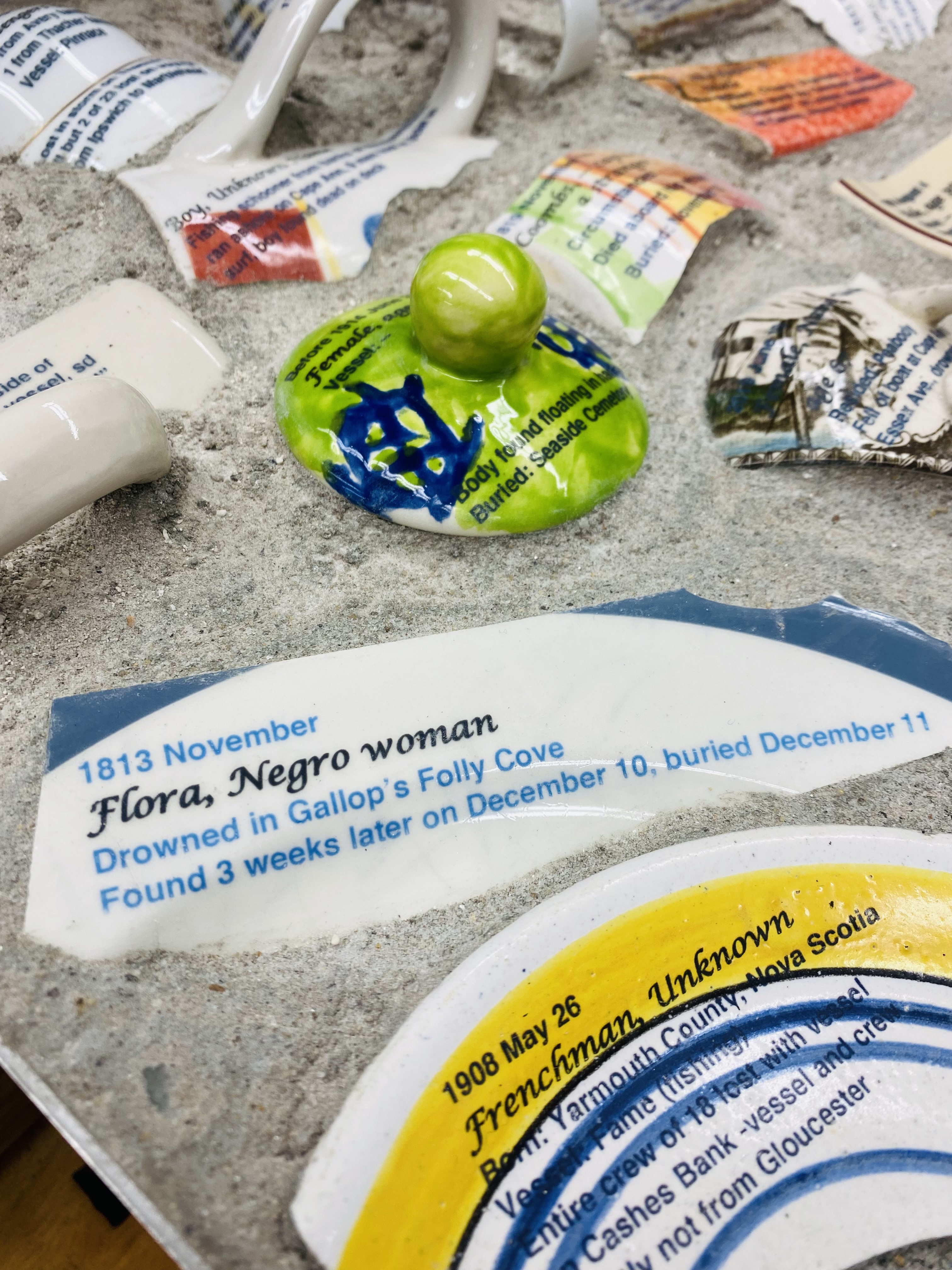 You can see the writing Diane Chen did this by hand the hole is where the rod will go to hold up these blocks Joe Numerosi of Numerosi Masonry helped with the first casting of cement. These will be mounted outside of the handicap entrance of City Hall. You will notice the pile of archives that on a table with broken plates etc.