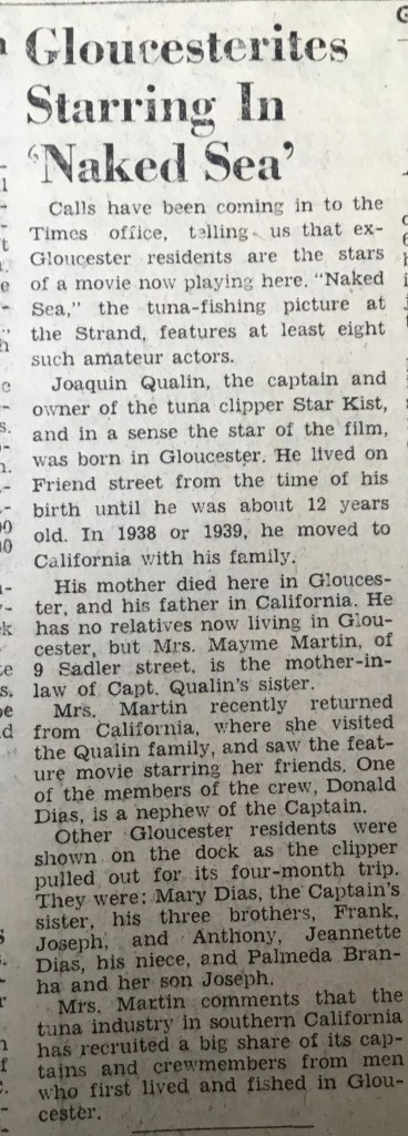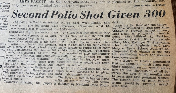 Here are a couple of headlines from February 1956 Gloucester Daily Times. Does it feel a little bit like history is repeating itself with news about vaccinations for children and Gloucester tuna fishermen?