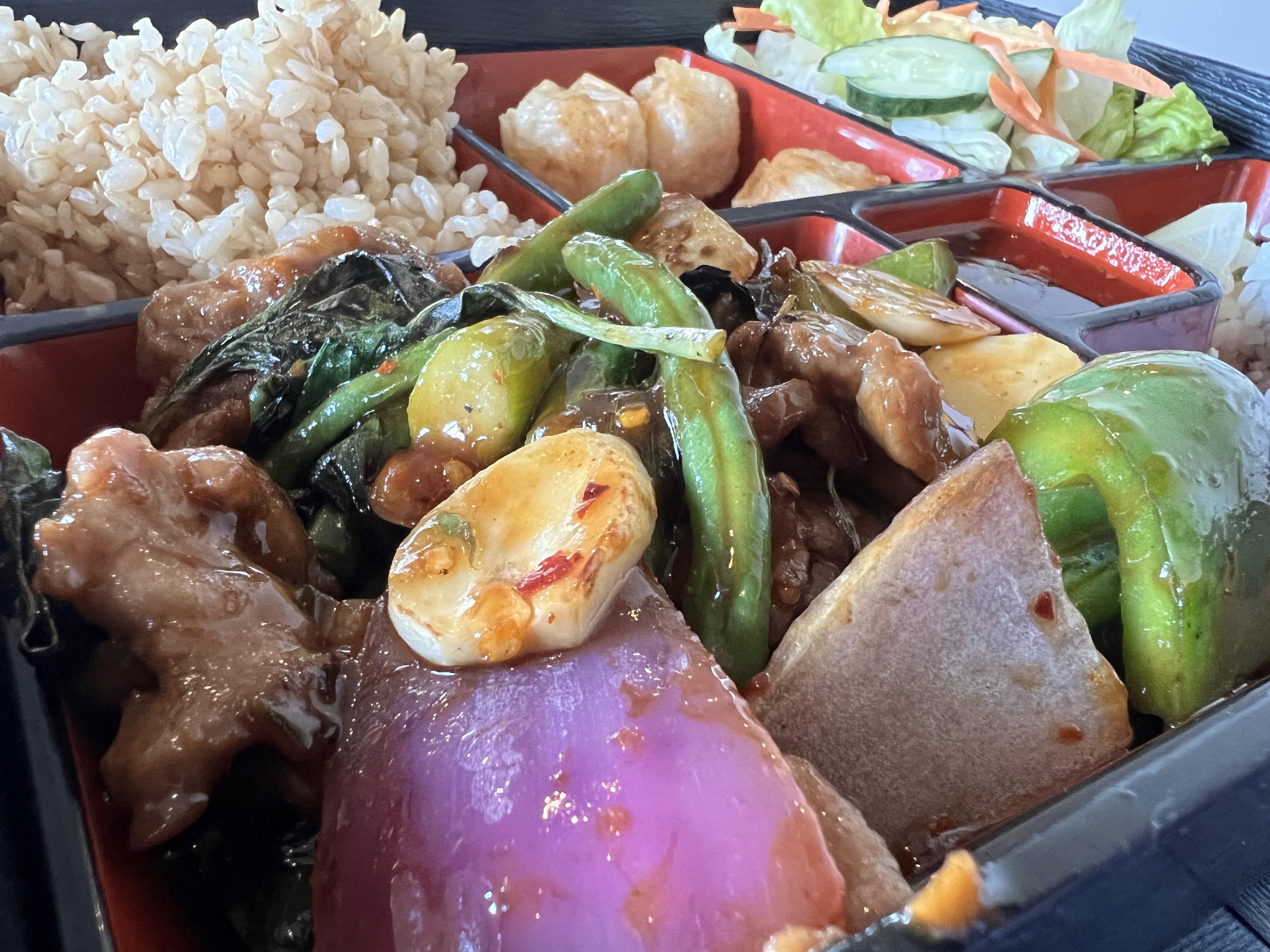 Crispy Chicken or Beef cooked in our special spicy sauce served with Bell Pepper, Zucchini and