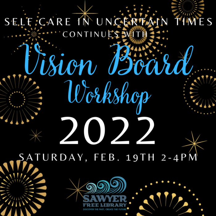 New Year! New You! Self-care in Uncertain Times continues at the Sawyer Free Library with Vision Board Workshop 2022 this Saturday, February 19 from 2-4pm.