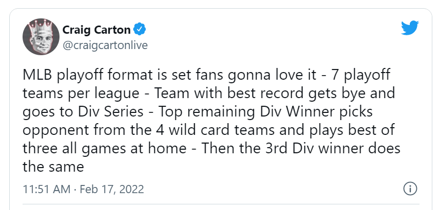 MLB playoff format is set fans gonna love it – 7 playoff teams per league – Team with best record gets bye and goes to Div Series – Top remaining Div Winner picks opponent from the 4 wild card teams and plays best of three all games at home – Then the 3rd Div winner does the same