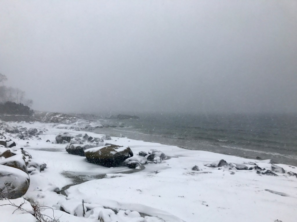 Walking Shore Road during the light snow, so pretty. Put the photo of rocks on Shore Road in Black & White.
