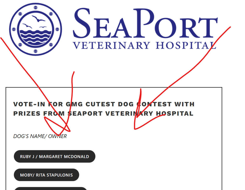 Preface: due to the overwhelming response of entries the contest will take a while to load. I will tell you this- IT’S WORTH IT! I suggest you click on the link to this post and let it all load before you start clicking any buttons. The amount of cuteness overload will no doubt put a smile on your face. I suggest you grab a notepad and view the photos in the gallery at your leisure. I just spent 9.5 hours editing all the photos and creating the poll. A bit frazzled but guess what? It’s National Puppy Day, no better way to start our play in voting. Thanks again to Ray Cahill and Seaport Veterinary Hospital who answered the call in a big way and donated the prizes for when we have the tournament from the entrants you the voters select in this pre play-in tournament.