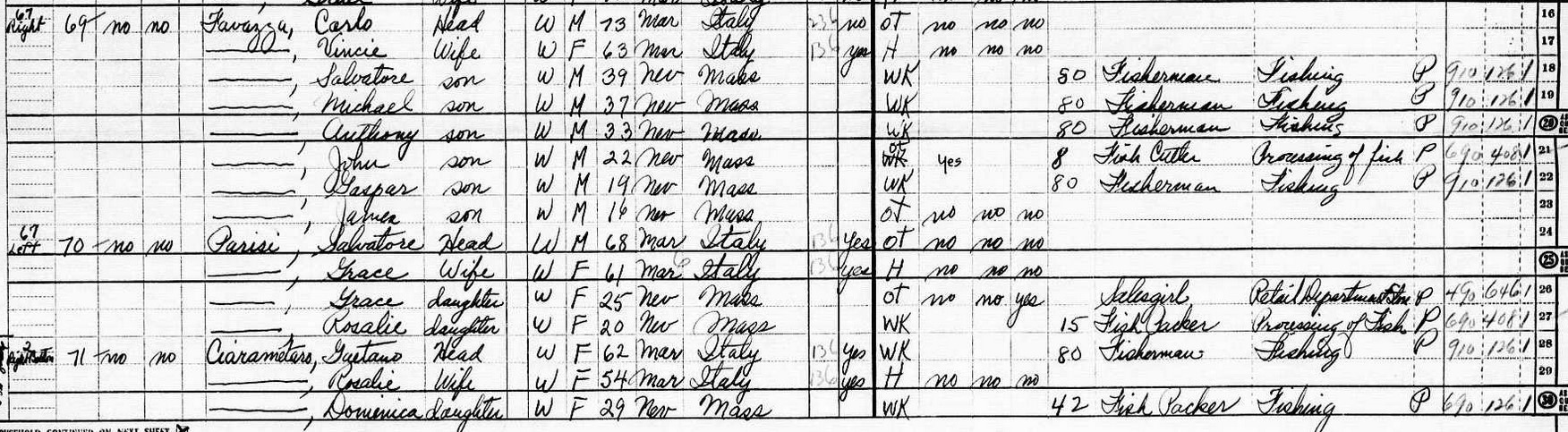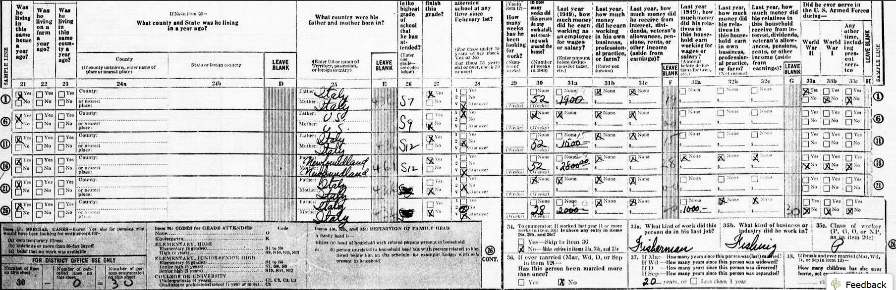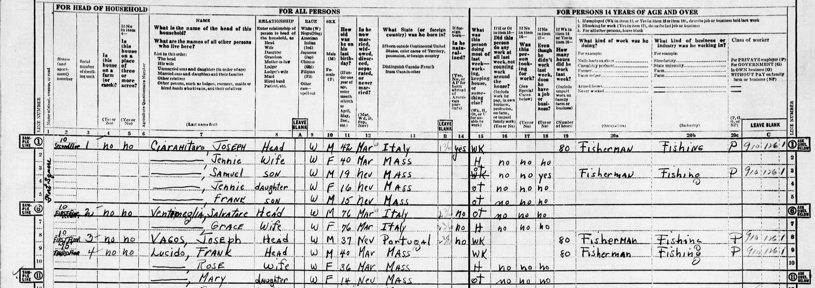 The 1950 federal census was released to the public last week after its mandatory 72 year old embargo. It is providing historians, genealogists and the general public an intriguing peek into post WWII life. Here are some samples from Gloucester with some familiar family names. These are families living in the Fort Square area of Gloucester in 1950. Fishing is the predominant industry which may seem obvious, but it’s still neat to see the varieties of occupations within that industry.
