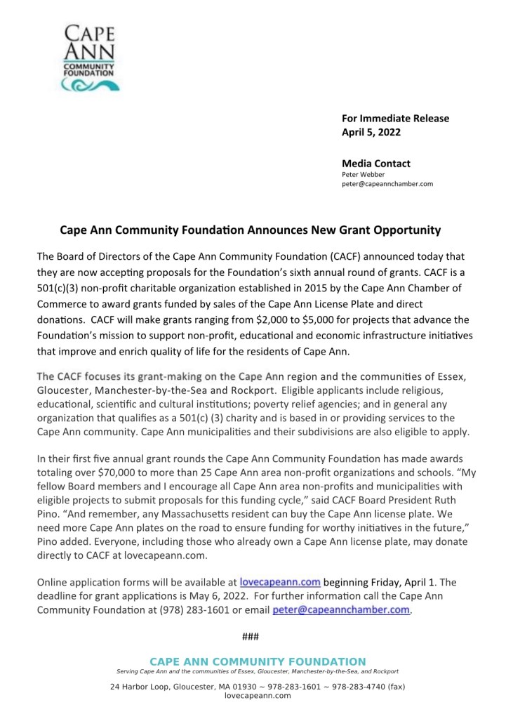 Please see the attached press release regarding the availability of online applications atwww.lovecapeann.com for 2022 Cape Ann Community Foundation grants.