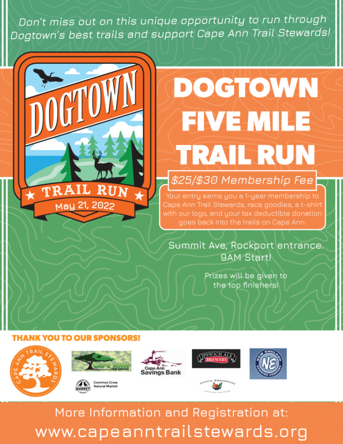 Register, then mark the calendar to lace up your shoes and join the 5-mile trail run through Dogtown on May 21st. Your entry fee includes a 1-yr membership to Cape Ann Trail Stewards (CATS), race goodies, tee shirt, bragging rights, and a tax deductible donation. Win-win for you and CATS who maintains trails throughout Gloucester, Essex, Rockport and Manchester. For more information and registration go to www.capeanntrailstewards.org See you in Dogtown on May 21st!