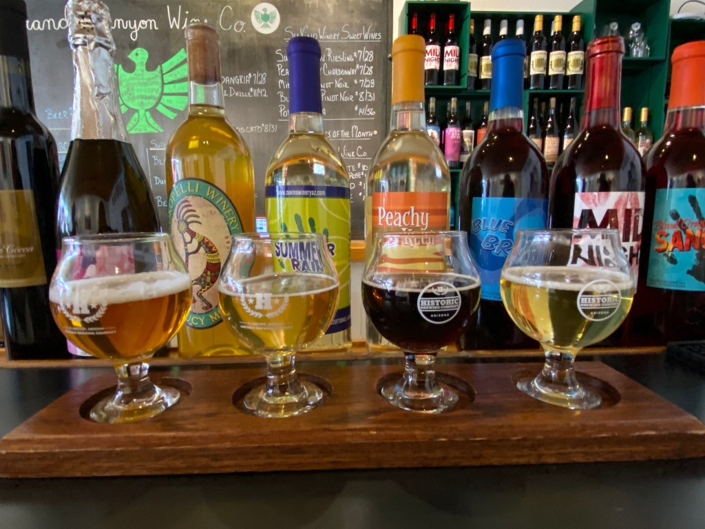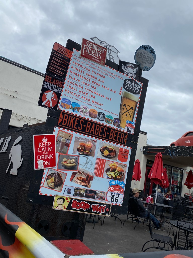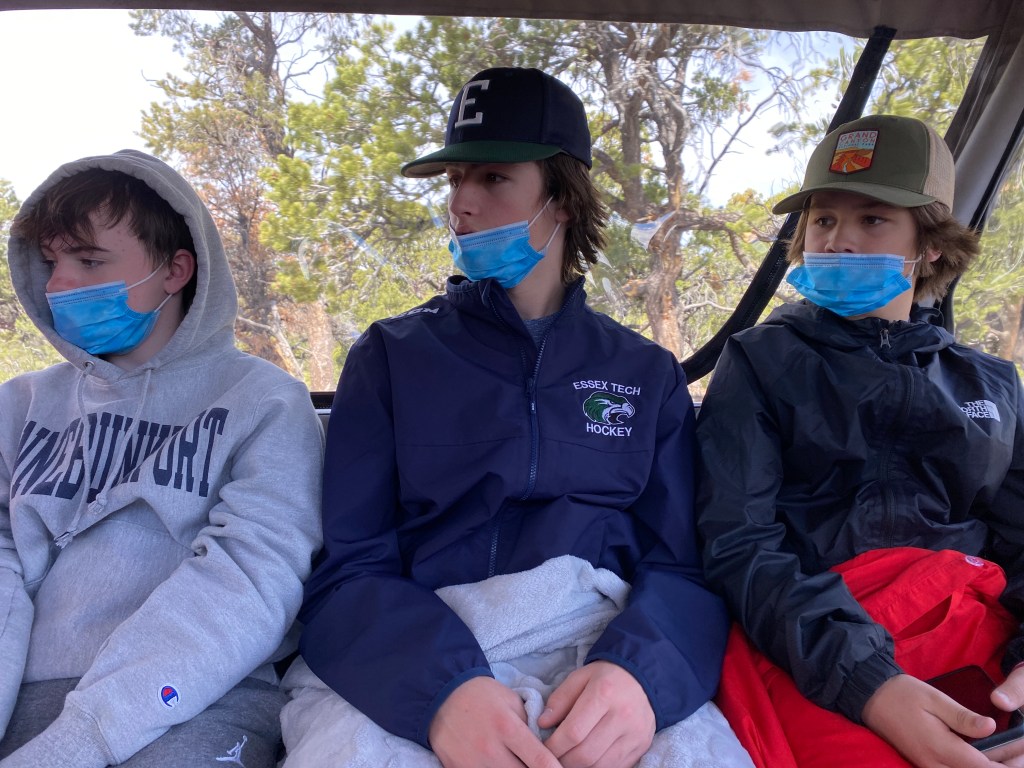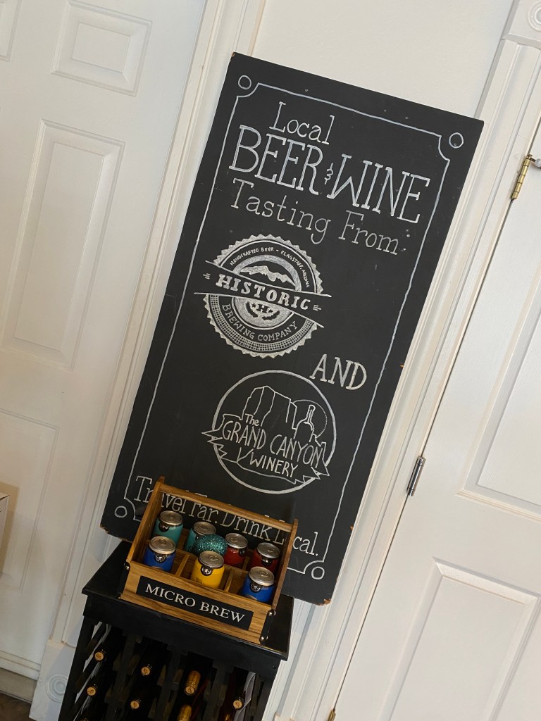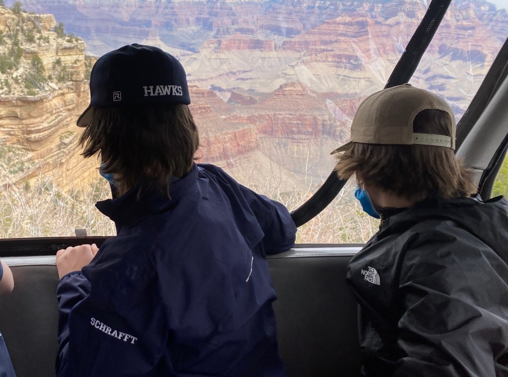 Grand Canyon and Williams, AZ. Day #2 of “Operation Head West, Young Men” consisted of a decent morning’s sleep, breakfast in our Airbnb, and then an easy 60 minute drive up to Tusayan to meet our Pink Jeep Tours guide, Ryan. Our group of six was joined by a nice couple, Robert (who looked so much like Will Farrell that I think he could actually pull it off if he wanted) and Christy. Ryan took us on a 3-hour tour of some of the Grand Canyon’s South Rim’s best scenic views and shared all sorts of great history/facts that we would never have learned on our own. More importantly with winds sometimes as high as 50 mph and pretty steady at 30-40 mph the whole time, we were really happy to not be driving our minivan rental on the windy (and windy….appropriate homograph) roads. For someone who loves to take photos, I left the Grand Canyon with surprisingly few….but, none of the boys fell into the canyon….so I consider that a win. There were times the winds were so strong that it was actually kind of alarming. I had seen the Grand Canyon before, but the boys had not. After some shopping and amazing gelato, we drove back to Williams and spent some time downtown. The town is adorable….albeit maybe a bit kitschy. We found the Grand Canyon Wine Company and enjoyed a flight of their beers and a little wine tasting while the boys went back to the house to ready their fishing gear. They wanted to go back to Lake Kaibab because they bought some garlic power bait as recommended by a nice woman who had landed 7 trout the day before, but we convinced them to fish the Santa Fe Dam at the edge of downtown instead….where, whoops, they caught nothing. We had dinner at a local Mexican restaurant and then smores by the fire pit back on our deck. It was still super windy….so we put the fire out early and are calling it a night. We have a 3-hour drive up to Page tomorrow…..where, here Joey does his happy dance….we pick up our 60 foot houseboat and see just “what can go wrong.”
