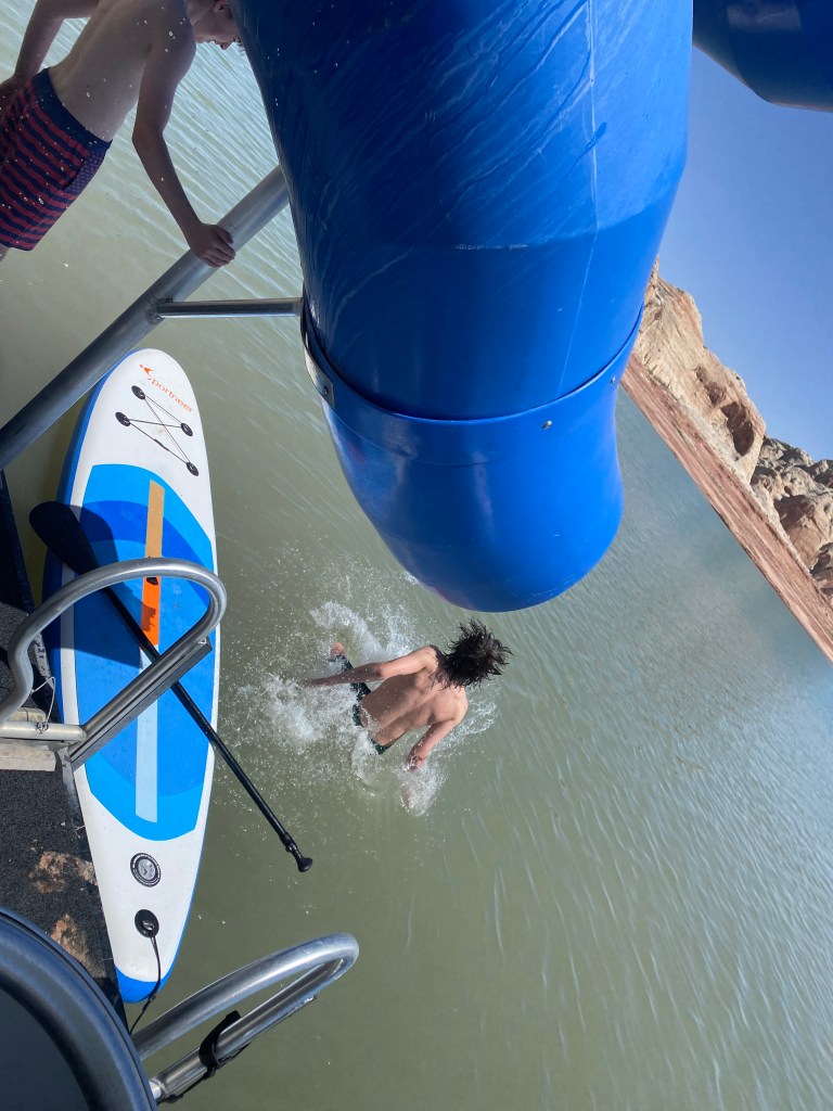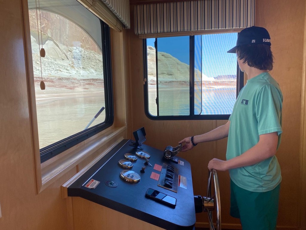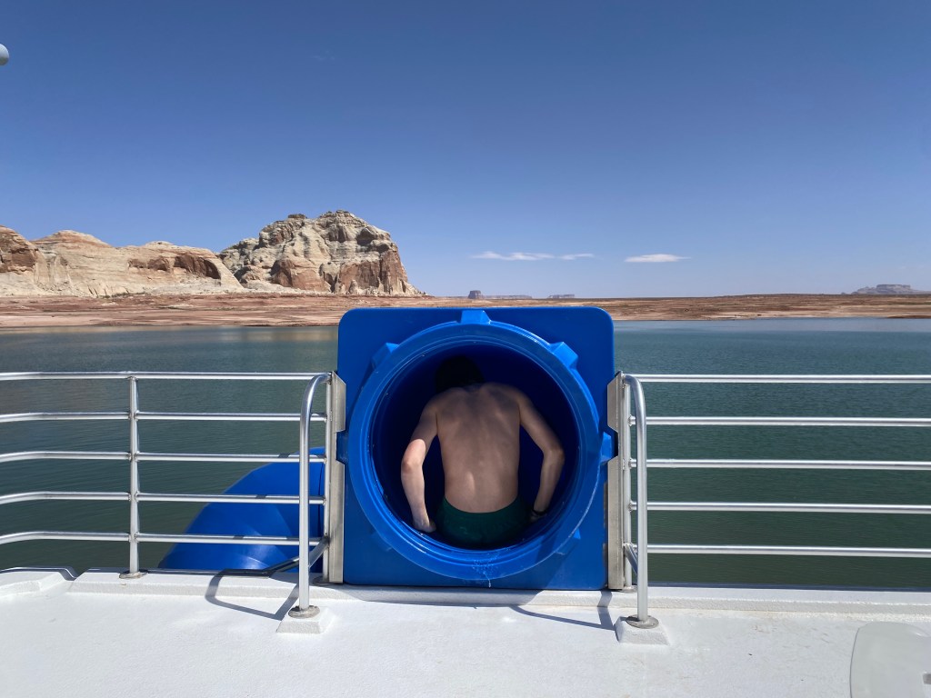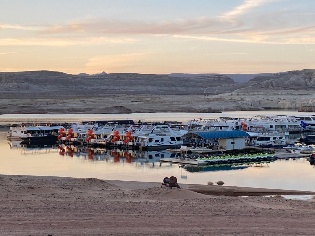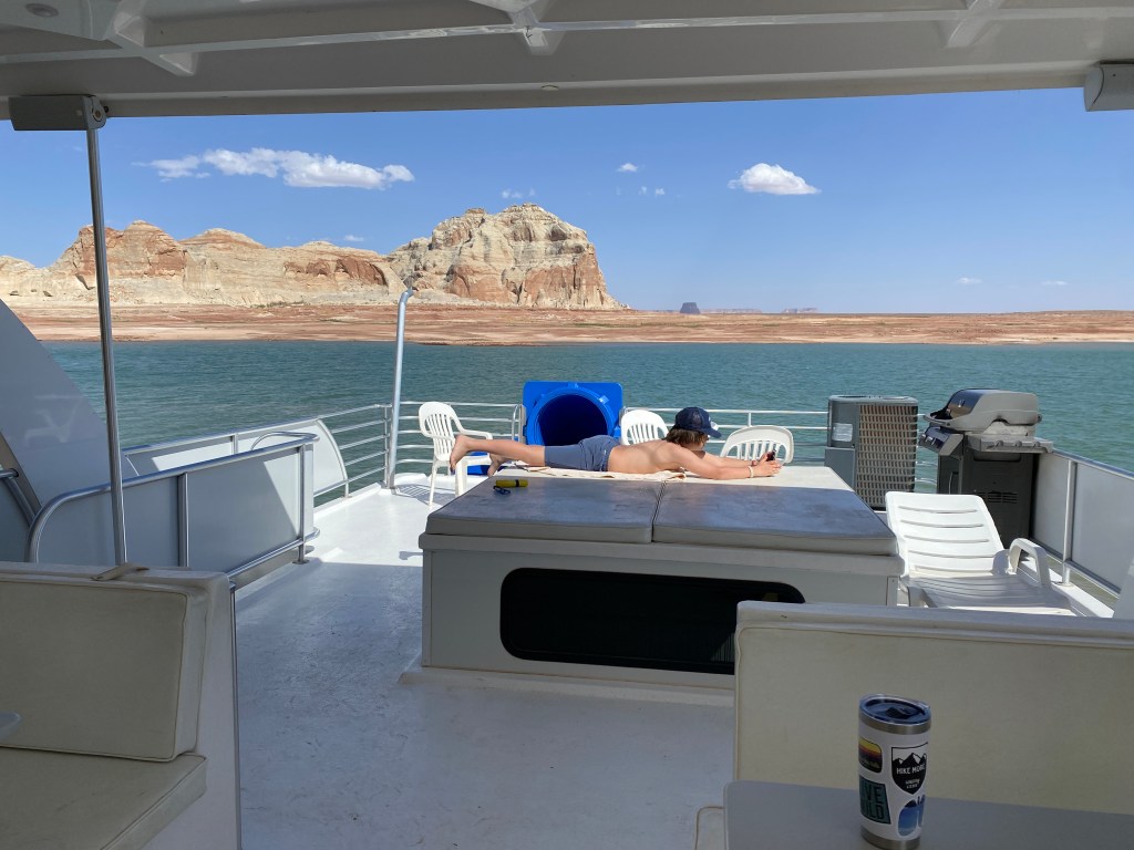 Joey has been dying for video of our epic fails and bloopers from houseboat living, but so far so good. After two days in Williams, AZ how do you super cute little Airbnb and a day trip to the Grand Canyon, we packed up the minivan to head to page, Arizona. We had to decide which way to go, but quickly a couple of fast spreading wild fires north of Flagstaff dictated the route we should take. Due to the detour we arrived at the Wahweap Marina couple hours later than planned. We still have to pick up three paddle boards, take our 30 minute houseboat operating lesson, and hit the grocery store for four days worth of food, supplies, and alcohol. No joke. By the time we were settled, it was 6 PM. We decided to stay put in the marina and relax. Boys fished and paddleboarded while we barbecued on the upper deck and relaxed. We got a good night’s sleep and prepared to leave the marina. The night before Kevin gave us a great lesson on how to work our 60-foot houseboat. Not going to lie, there was a lot to learn. This morning, AJ piloted us out past the gas dock, was picked up by another marina employee, and we were on our way. While not necessarily our intention from the get-go, we immediately started to rely on Thatcher to run the boat. We opted to not head the 2 1/2 hours past the Glen Canyon Dam, but to stay a bit closer to the safety of the marina. We took a 30 minute cruise and found a secluded and protected cove. We had been taught to beach the houseboat in the safety of the Highwinds that are coming in a couple of days and also obviously far away from any rocks. We have a giant area completely to ourselves. We have spent the entire day paddle boarding, fishing, hiking, and relaxing. Super sketchy Wi-Fi but every once in a while it kicks in. we are constantly trying to be aware of Lake Powell’s ever receding water to make sure that we don’t get stuck on the beach. We dug 4 3-foot holes to bury four anchors and packed them with wet sand. We’ve been readjusting the slack in the lines and switching back-and-forth from the generator running and not, but other than that it’s pretty chill. A little bit nervous about our first night’s sleep and whether or not we will break free. Fingers crossed! Can’t say enough about this trip! Hopefully making memories to last a lifetime.
