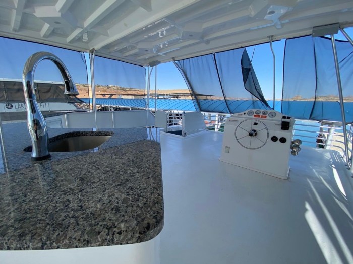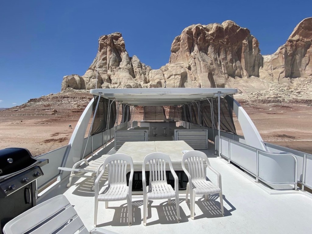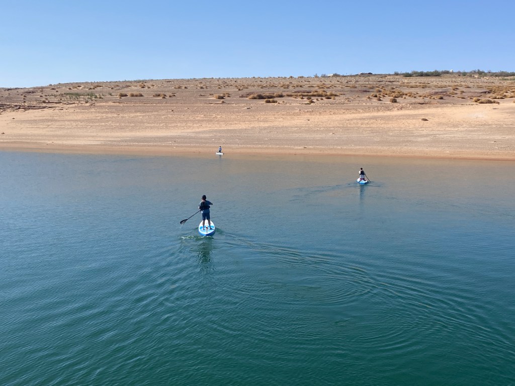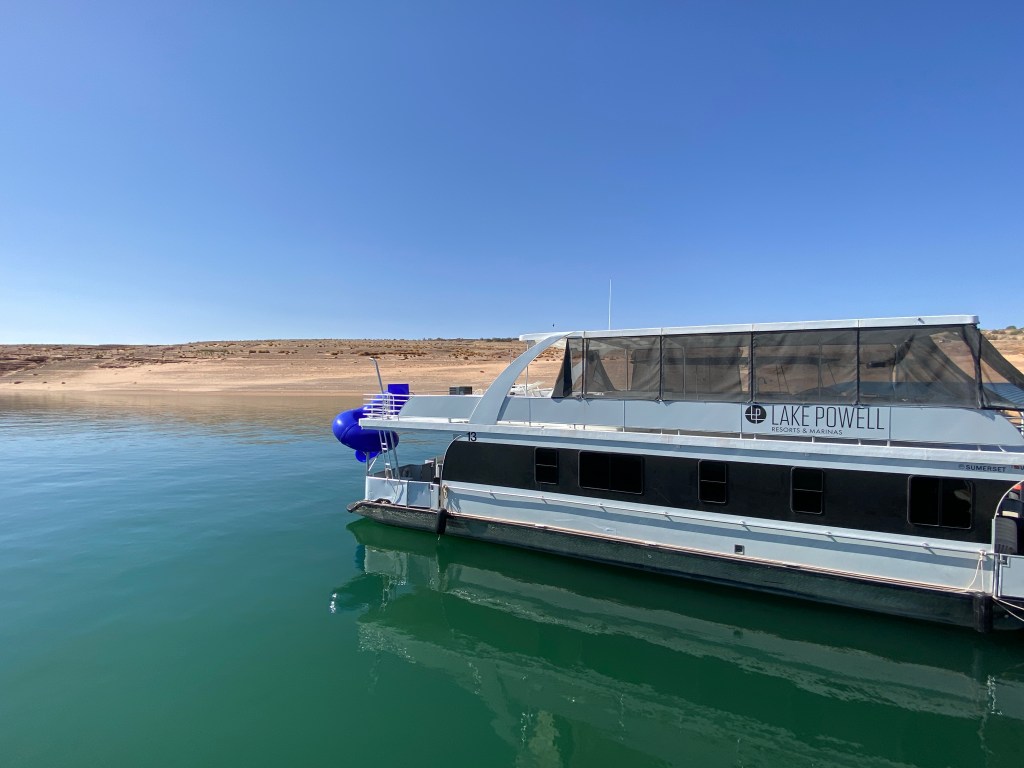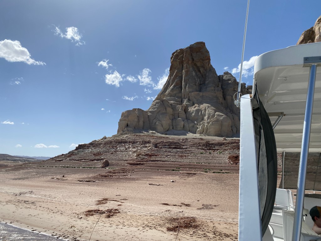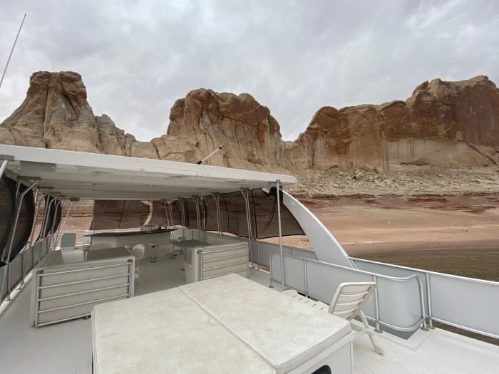 Joey has been dying for video of our epic fails and bloopers from houseboat living, but so far so good. After two days in Williams, AZ how do you super cute little Airbnb and a day trip to the Grand Canyon, we packed up the minivan to head to page, Arizona. We had to decide which way to go, but quickly a couple of fast spreading wild fires north of Flagstaff dictated the route we should take. Due to the detour we arrived at the Wahweap Marina couple hours later than planned. We still have to pick up three paddle boards, take our 30 minute houseboat operating lesson, and hit the grocery store for four days worth of food, supplies, and alcohol. No joke. By the time we were settled, it was 6 PM. We decided to stay put in the marina and relax. Boys fished and paddleboarded while we barbecued on the upper deck and relaxed. We got a good night’s sleep and prepared to leave the marina. The night before Kevin gave us a great lesson on how to work our 60-foot houseboat. Not going to lie, there was a lot to learn. This morning, AJ piloted us out past the gas dock, was picked up by another marina employee, and we were on our way. While not necessarily our intention from the get-go, we immediately started to rely on Thatcher to run the boat. We opted to not head the 2 1/2 hours past the Glen Canyon Dam, but to stay a bit closer to the safety of the marina. We took a 30 minute cruise and found a secluded and protected cove. We had been taught to beach the houseboat in the safety of the Highwinds that are coming in a couple of days and also obviously far away from any rocks. We have a giant area completely to ourselves. We have spent the entire day paddle boarding, fishing, hiking, and relaxing. Super sketchy Wi-Fi but every once in a while it kicks in. we are constantly trying to be aware of Lake Powell’s ever receding water to make sure that we don’t get stuck on the beach. We dug 4 3-foot holes to bury four anchors and packed them with wet sand. We’ve been readjusting the slack in the lines and switching back-and-forth from the generator running and not, but other than that it’s pretty chill. A little bit nervous about our first night’s sleep and whether or not we will break free. Fingers crossed! Can’t say enough about this trip! Hopefully making memories to last a lifetime.