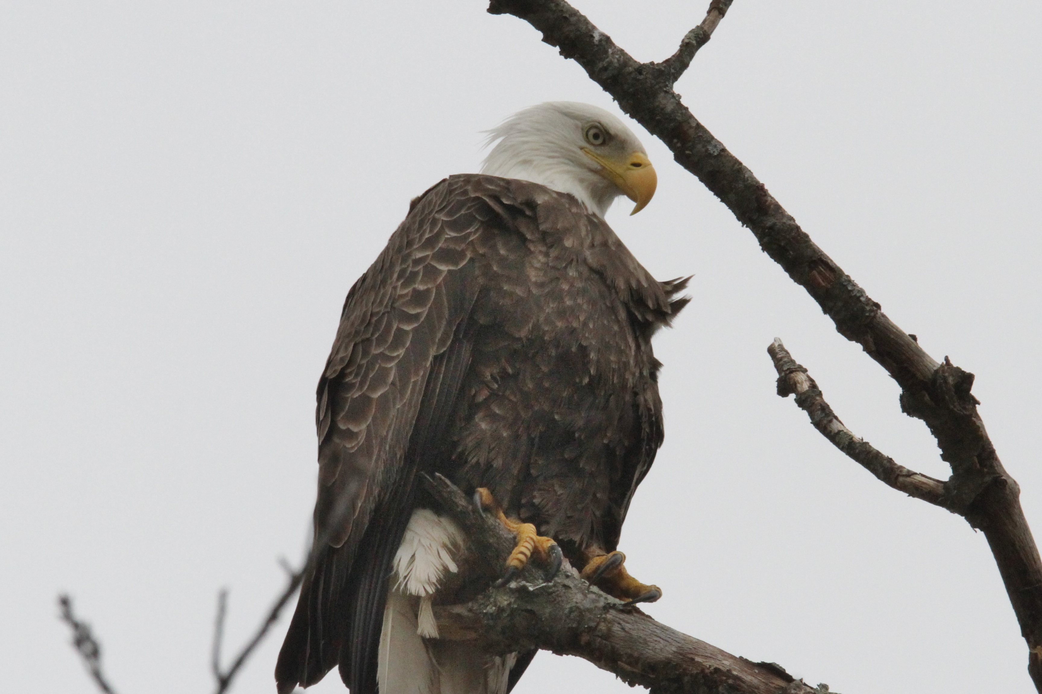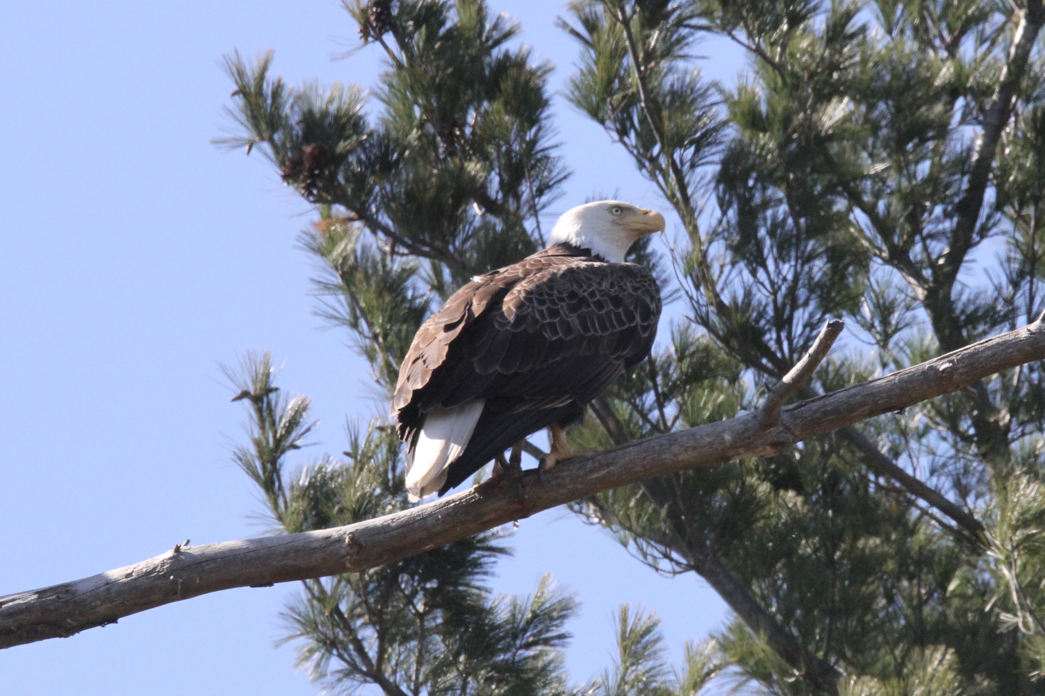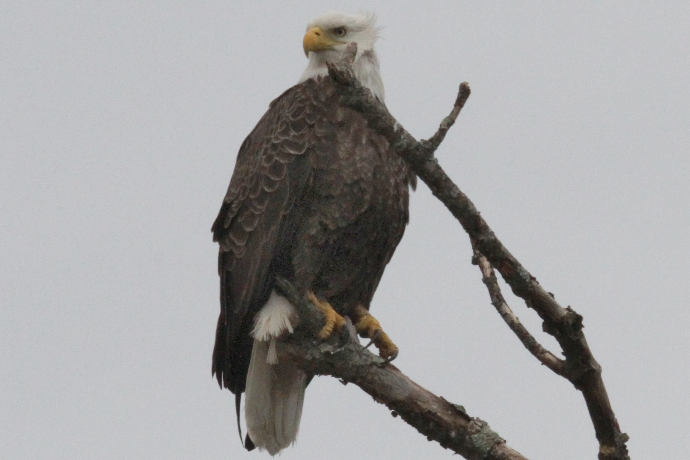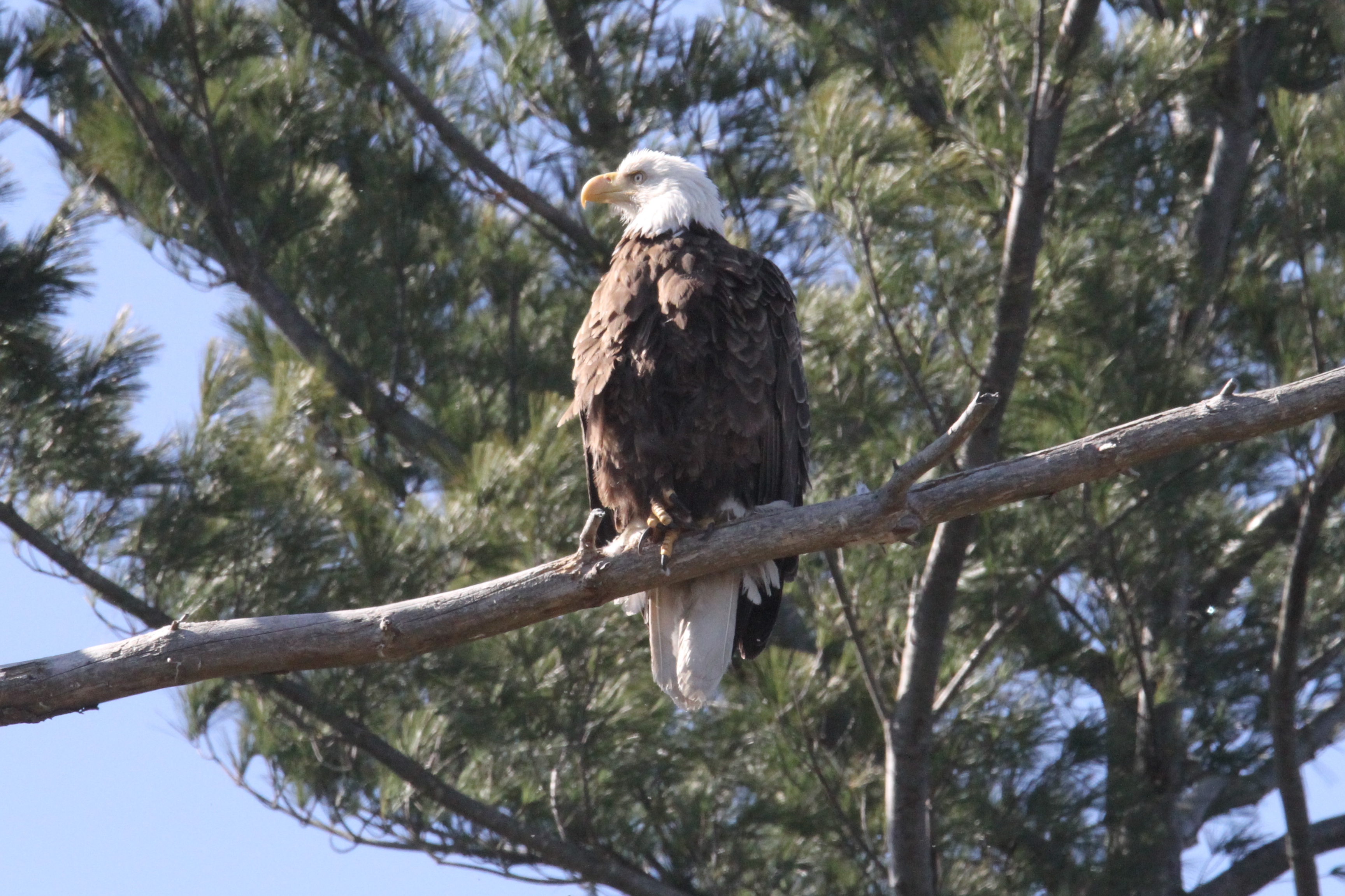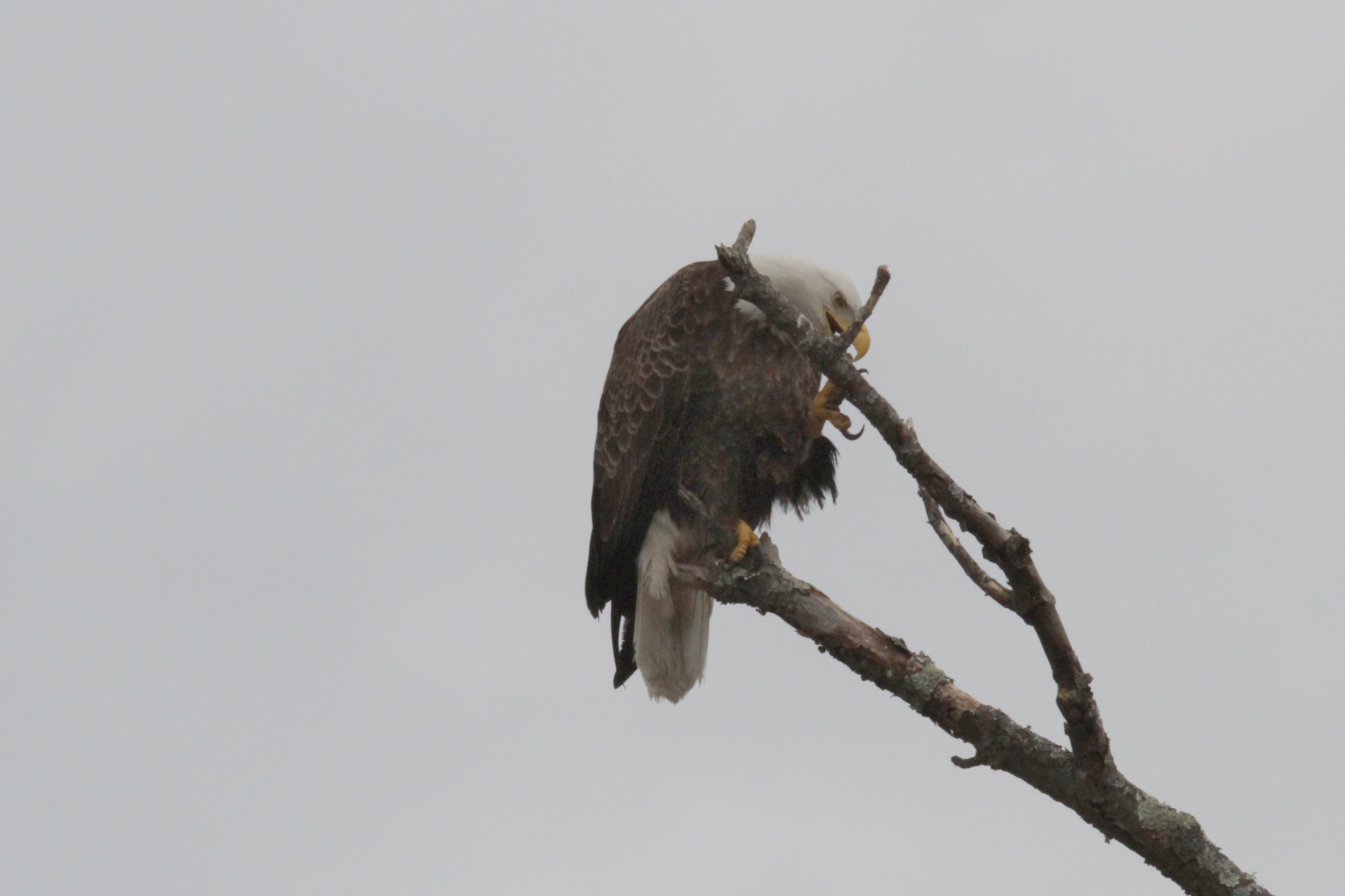 There was a turn of events in the story of the West Gloucester eagles last week you may be interested in. There is a nest in the area and I am pretty sure there are eggs in it since there’s ALWAYS an eagle in there indicating typical nesting behavior. So we can expect to see two eagles within sight of the nest. I should have realized this myself. Yet, I found myself surprised to notice bands on one of the eagles but no bands on another. Each of them were on watch in trees near the nesting area. The banded eagle may have a band on each leg which could prove enlightening someday for researchers. In the meantime, let’s hope for viable eggs and chicks in West Gloucester!