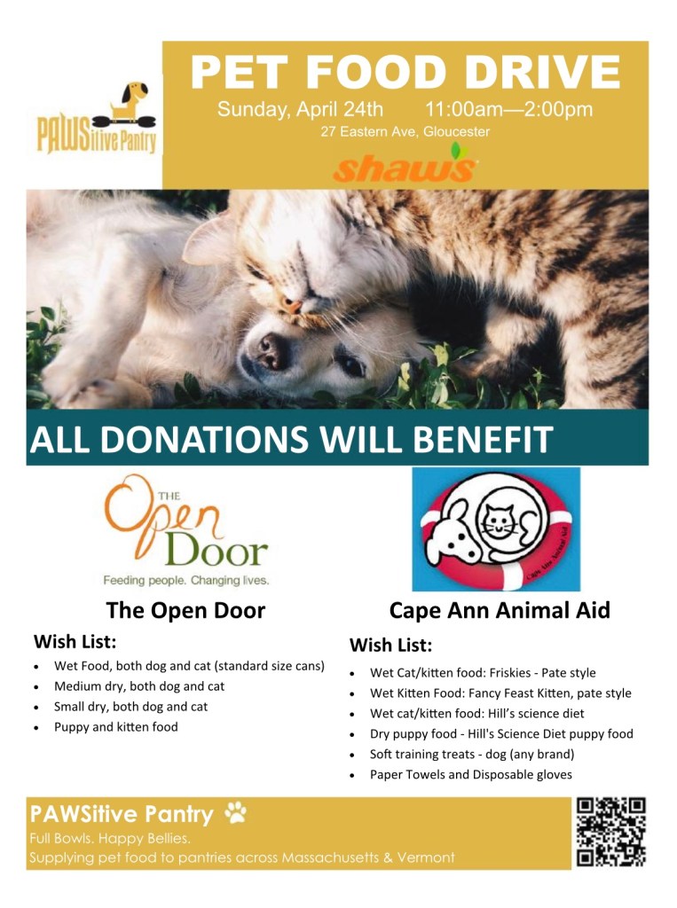 Contacting you regarding a couple of upcoming events in Gloucester. PAWSitive Pantry (www.pawsitivepantry.org) is a nonprofit volunteer group that provides pet food to food pantries and other social service agencies like Meals on Wheels etc, in MA and VT. We work with many animal shelters to distribute the food where it is needed most, and we will be having a pet food drive outside the Eastern Ave Shaw’s in Gloucester on April 24 from 11-2. The food raised will be distributed between our partner Cape Ann Animal Aid and also The Open Door food pantry, which we support with pet food as we are able. There is also a rescue reunion event at Cape Ann Animal Aid on June 18, which we will have a table at to raise awareness and funds for PAWSitive Pantry. This should be a fun community event!