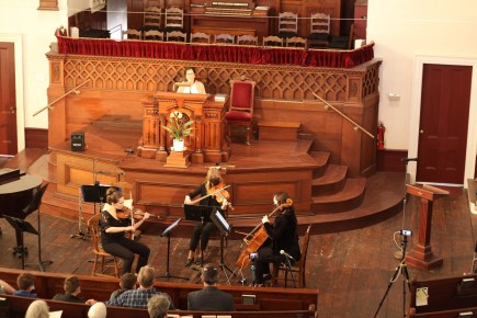 Composer Abigale Reisman performs her piece “Gedanken” for string trio with Anna Seda, cello and Rebecca Hallowell, viola