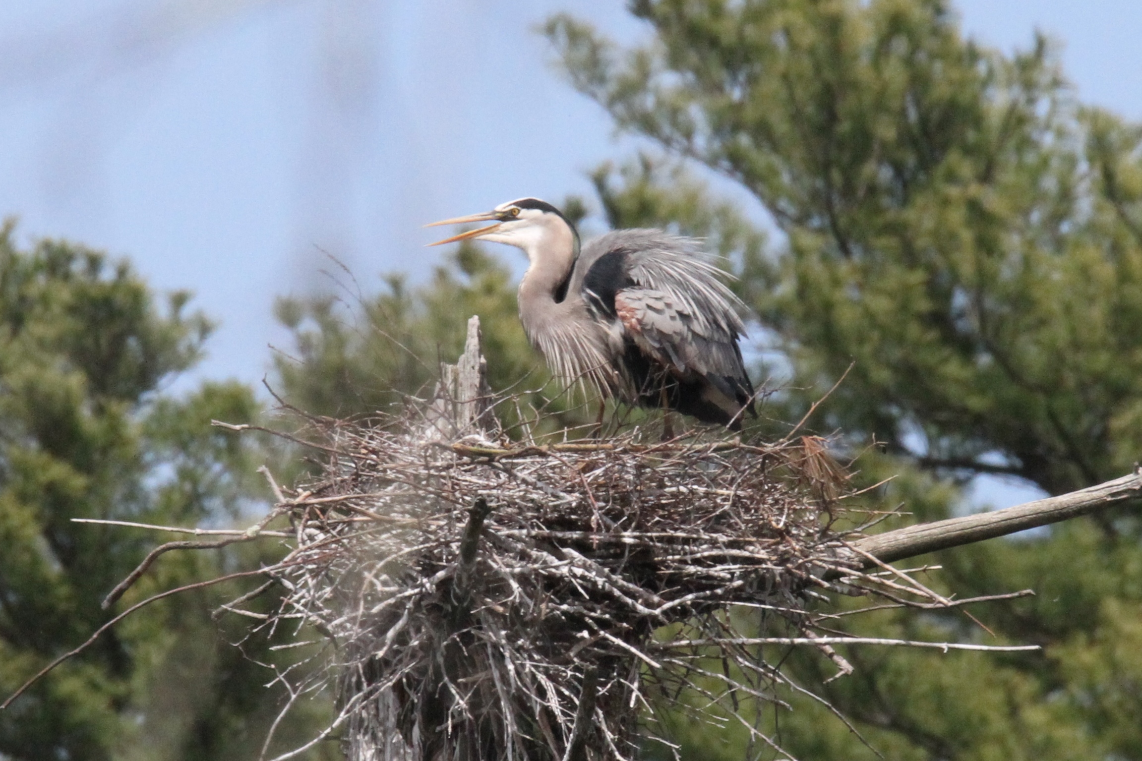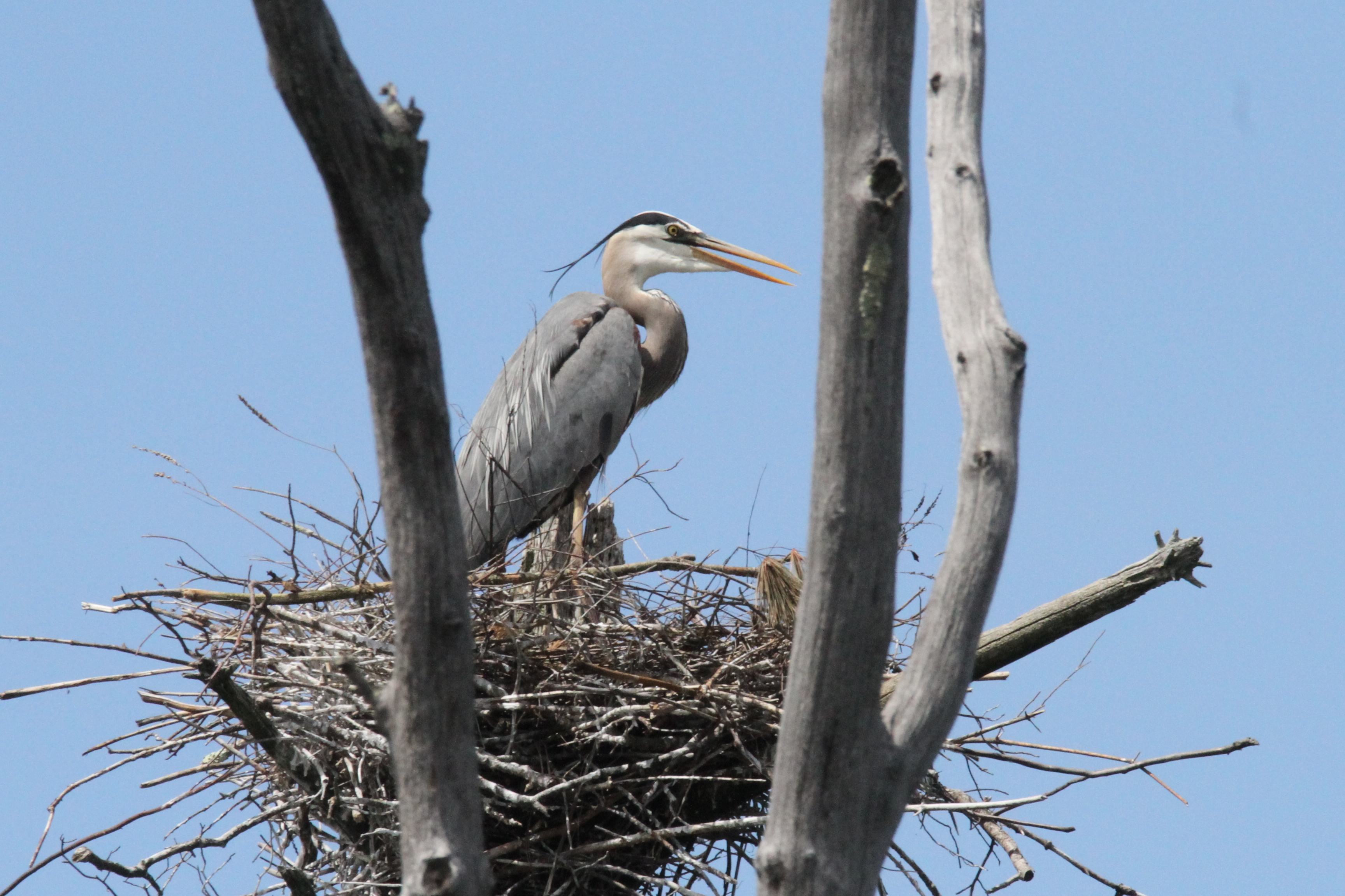Spring has sprung at the heron rookery near Georgetown. I stopped by on such a warm day that it seemed some of the adult herons were compensating for the heat by panting and wing spreading. There are babies in most of the nests; as well as some adult pairs still getting nests prepared with sticks and other material. There are several nests in this rookery and I saw evidence of maybe a dozen chicks. Always a great treat.