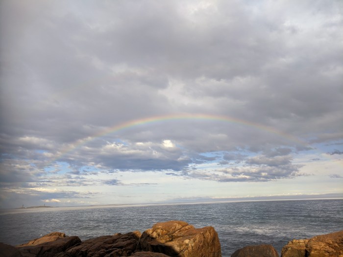 May 28, 2022. View to Thacher Island , rainbow across the sea