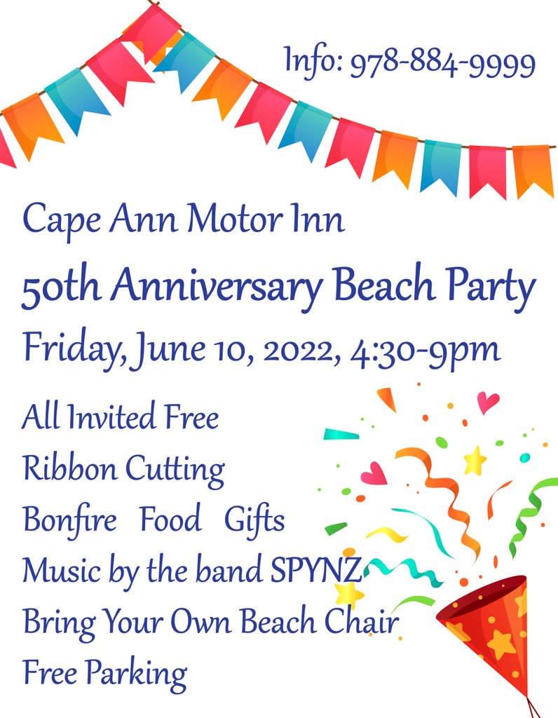 Help the Cape Ann Motor Inn celebrate their 50th Anniversary by joining them at a beach party on Friday evening! June 10th 4:30-9:00 pm. All are invited FREE. Join them for a ribbon cutting, bonfire, food, and free parking. The SPYNZ will be performing too! You won’t want to miss them! What a great way to celebrate 50 years of success and kick off a fun summer weekend! Congratulations to Cape Ann Motor Inn for 50 years of business! Click this link to view full flyer.