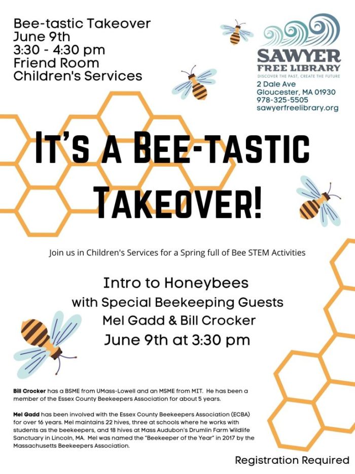 DON’T MISS THE FUN! Register HERE for this special BEE Stem Program at the Sawyer Free Library.