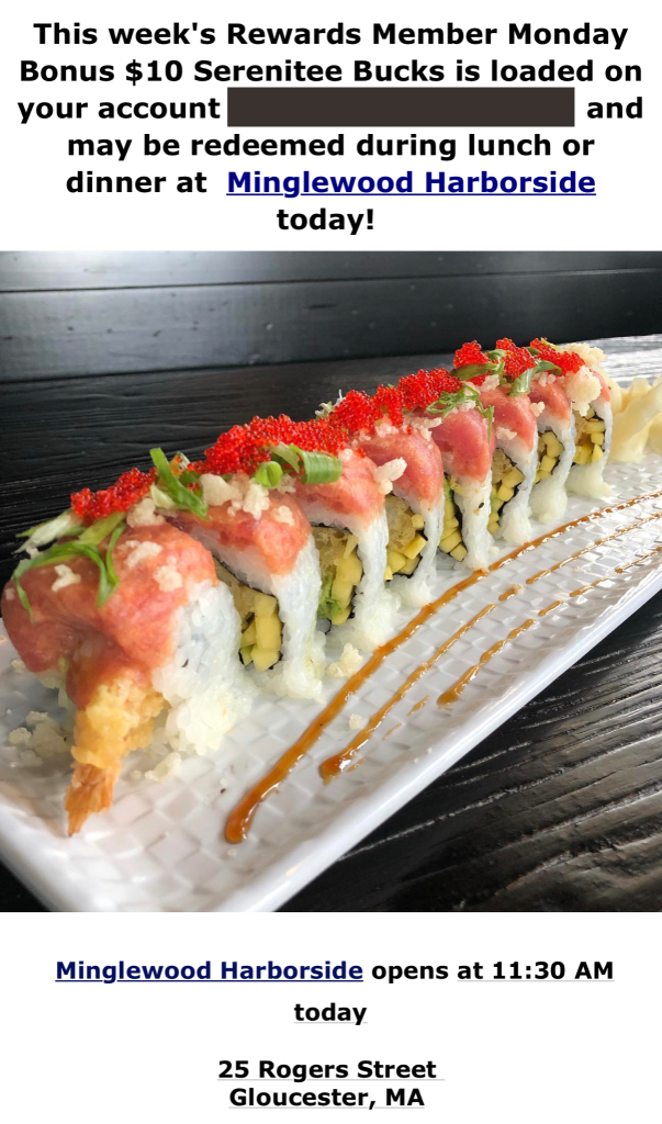 And we’ll give you Bonus Rewards throughout the year; like $10 off, a free dessert or sushi roll