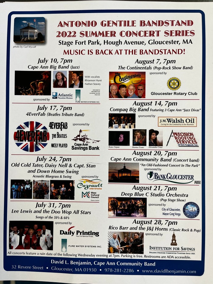 The Antonio Gentile Bandstand Concert Series is back on summer Sunday evenings starting July 10 at 7 PM at the bandstand at Stage Fort Park. Here’s the link for further information. This event has been greatly missed by many and we are so pleased to see it return.