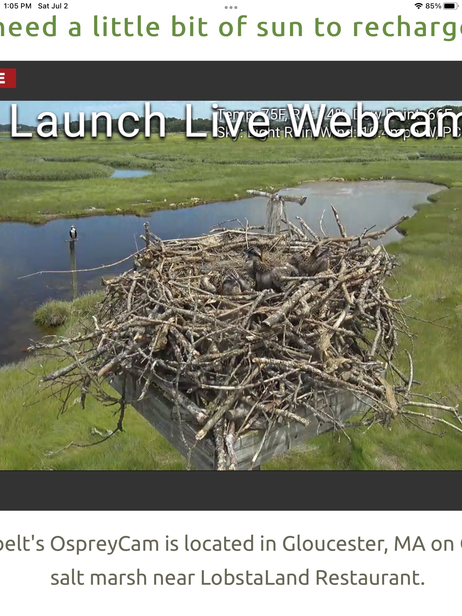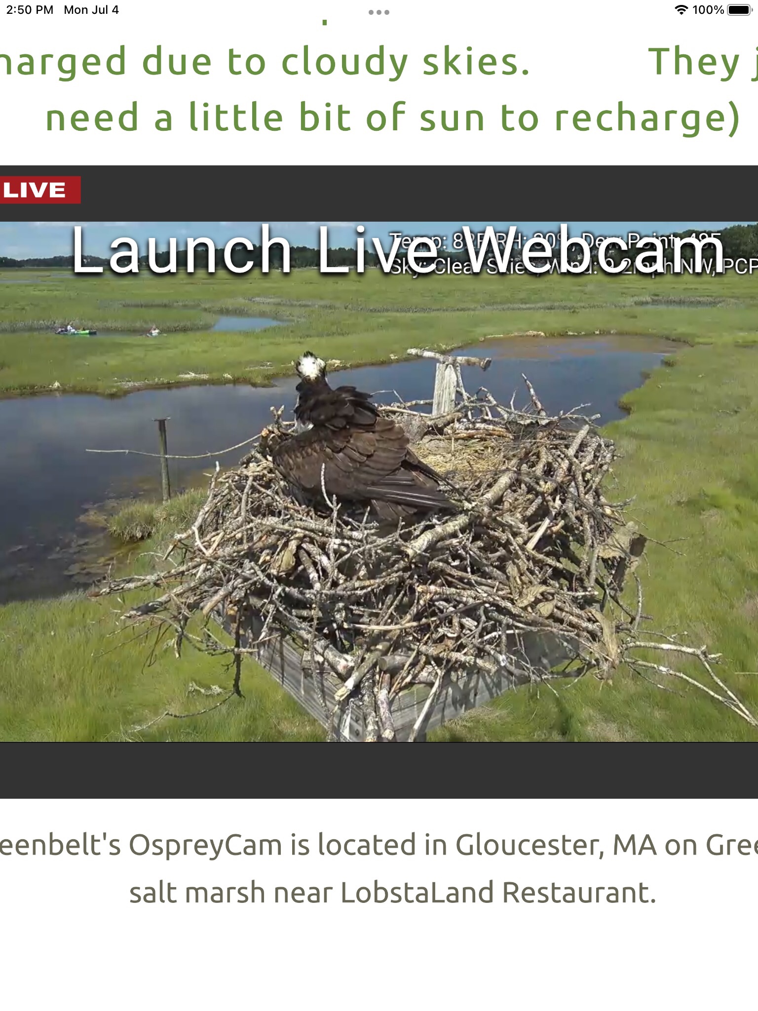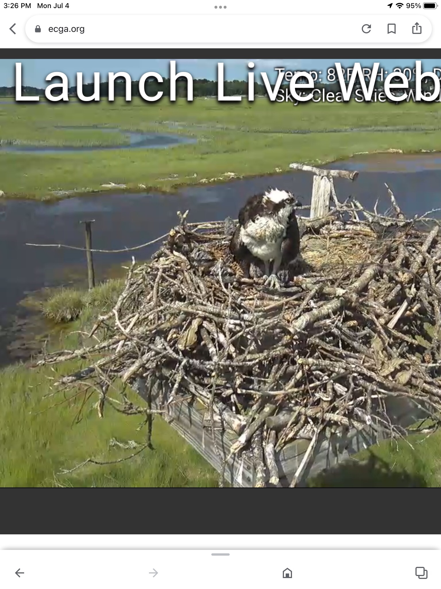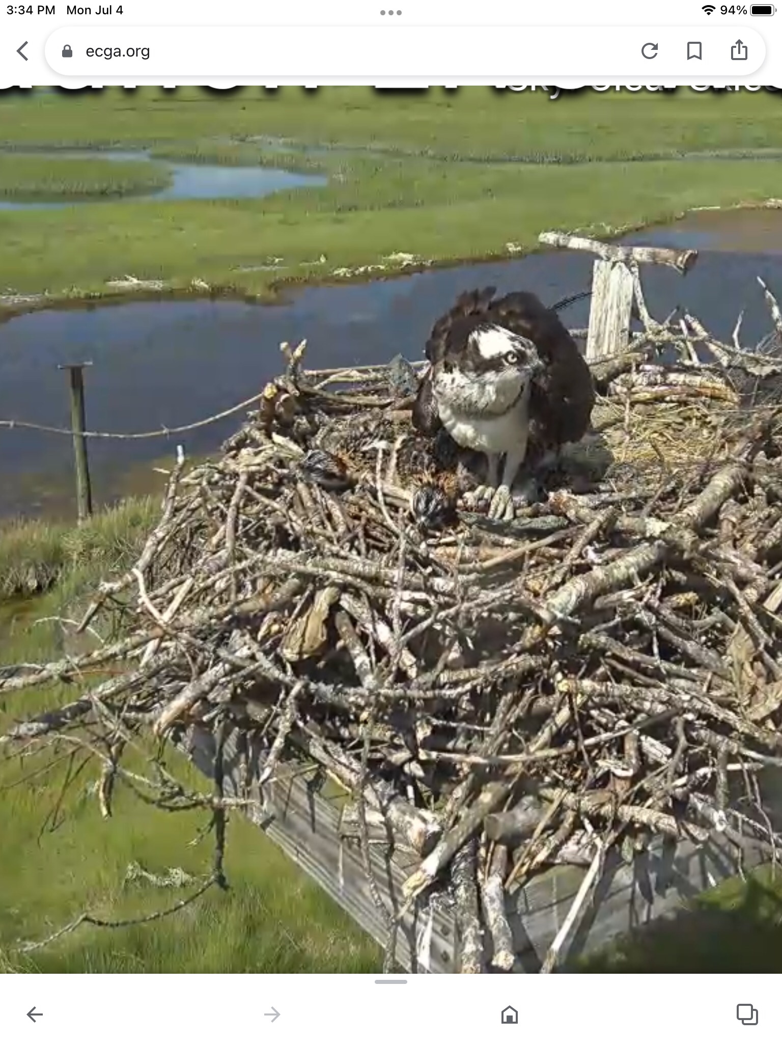 The three osprey chicks in the LobstaLand nest have been named Pip, Squeak, and Ollie and are now about a month or so old. If you watch the Essex Greenbelt Osprey Cam as diligently as I do (some might go so far as to call it an obsession), you will notice the parents Annie and Squam taking excellent care of them. In this series of screenshots taken over a couple of days’ time, you can clearly see the chicks are very well camouflaged in the nest and have a parent providing cover as additional protection. It’s quite delightful to watch them grow. In one of these screenshots, you can see a couple of kayakers checking the nest out from a safe distance. The Essex Greenbelt Osprey project gratefully accepts donations if you are interested and able. They are also seeking volunteers. Enjoy!