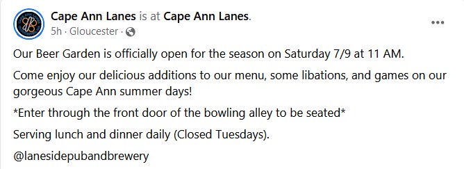 Sharing news borrowed from Cape Ann Lanes Facebook page that their new beer garden will be opening today at 11 AM. Looks wonderfully relaxing.