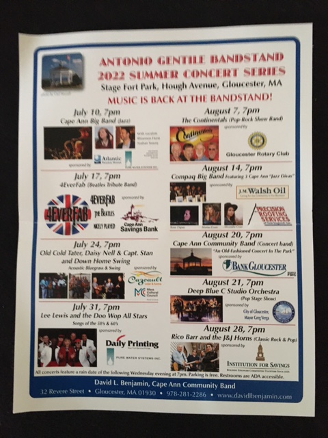 We attended the Beatles concert last night at the Antonio Gentile Bandstand at Stage Fort Park . Perfect evening and an amazing concert . They even had free ice cream !