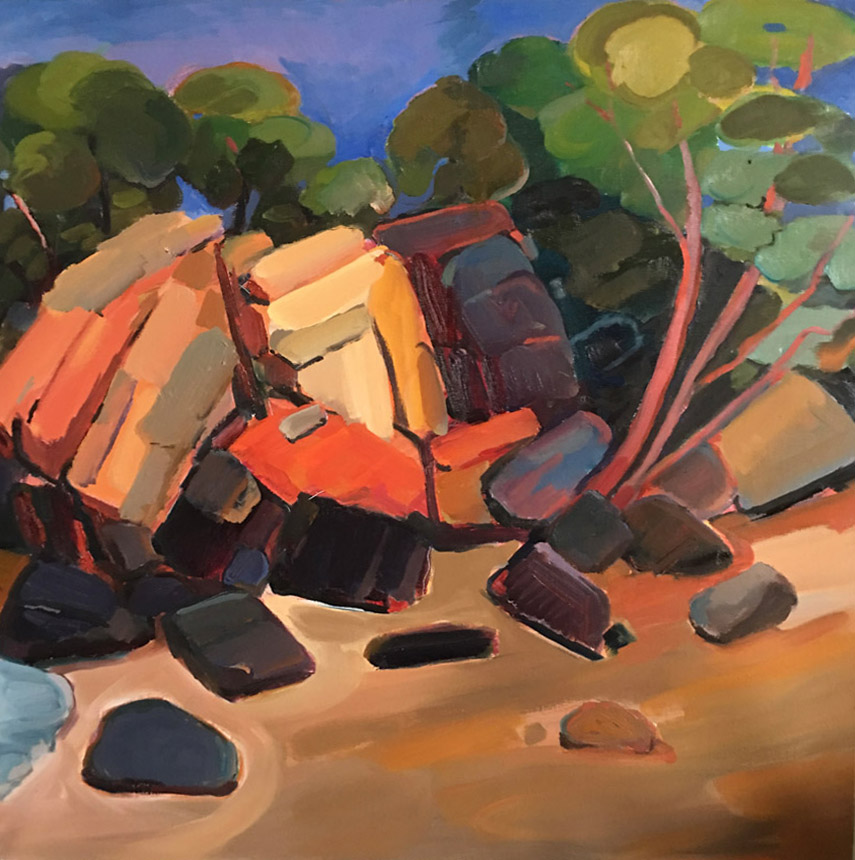E_Mueller_Plum Cove Beach_oil on canvas_30x30 inC_St John_Remembering When_gouache_ 25 x 31 inJ_McDonald-oilonpaper-cityscape_30x22Joan Frank LandscapeP_Sullivan_ Solstice; oil on birch panel; 36 x 36 in