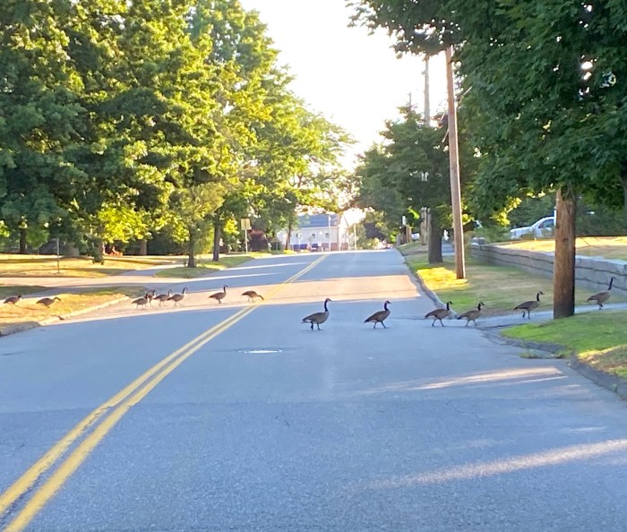 Make way for Geese. I dropped three teenagers off at 6:45 this morning for three hours of hockey in Peabody and drove the long, winding way to work to enjoy some early morning quiet. I was happy to pause and watch this gaggle of geese slowly cross the road. With no other cars in sight I got to sip my coffee and not feel the need to hurry up and scoot around them as they made their way from the pond to the cemetery. Slowing down is good.