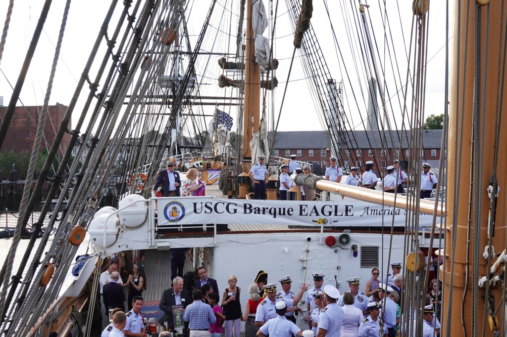 US Coast Guard Eagle docked at the Charlestown Navy Yard, BostonBoarding Eagle for the reception for the USS Constitution MuseumAll food prepared by Eagle’s onboard crewEnjoying hospitality and the view on multiple decksCelebrating the occasion – USCG RADM John Mauger at the podiumEagle’s CAPT Jessica Rozzi-OchsUSS Constitution’s CDR BJ FarrellUSS Constitution Museum’s President and CEO Anne Grimes RandEvening colors, striking the flagsSpectator boats observing colors and firing of USS Constitution’s cannonSunset with USCG Eagle and USS Constitution bow-to-bowSunset through USS Constitution’s rigging, from Eagle’s bow