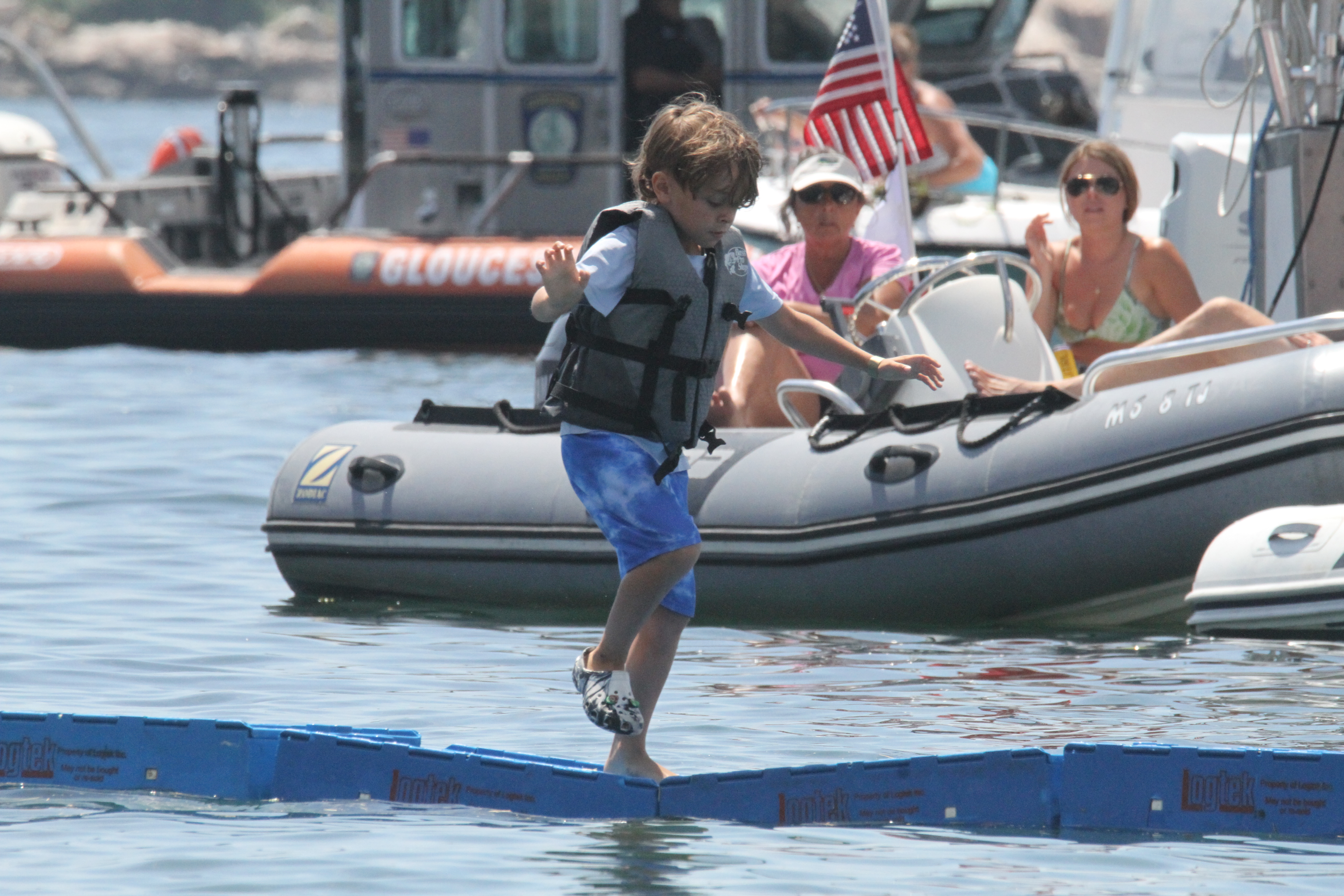 The first Lobster Crate Race was held yesterday at Pavilion Beach to a large and appreciative crowd of supporters. The Gloucester Police Department put this fundraiser together to support the Gloucester High School weight room renovation and by all accounts, it was a huge success. There were 4 classes of participants that took their chances running across a bridge made of plastic crates that bounced and tilted with the waves. As expected, the youngest and lightest were most successful. There was a Municipal group which will need a great deal more practice before next year’s event. The event drew several boats, pedestrians and beach-goers who cheered everyone on with enthusiasm. Follow the Gloucester Fishermen Athletic Association on Facebook for updates and donation information.