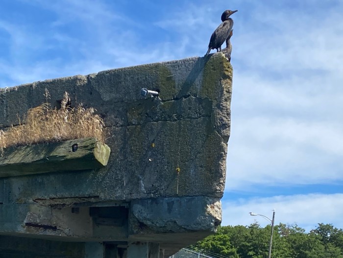 This fella appeared to be standing guard over the harbor from his perch on the jagged pier.