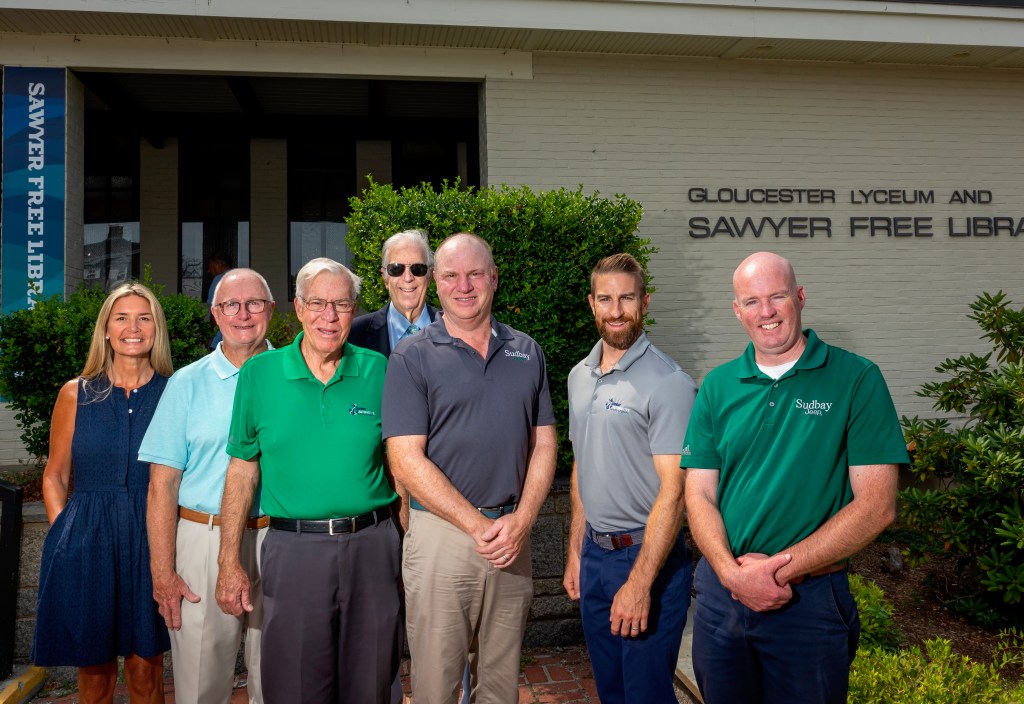 PHOTO: Members of the Sudbay Automotive gather at Sawyer Free Library to mark the occasion of the dealership’s $100,000 contribution to the renovation and expansion of Cape Ann’s oldest public library (sawyerfree2025.org). (l to r) Sawyer Free 2025 Campaign Manager Sarah Oaks, Sawyer Library Foundation Steering Committee member Bill Cuff, Sawyer Free 2025 Campaign Chair Barry Weiner, Sudbay Automotive Owner Don Sudbay Jr., Sudbay Automotive Owner Dave Sudbay, Sudbay Automotive Owner Brad Sudbay and Sudbay Automotive Owner Tim Sullivan.