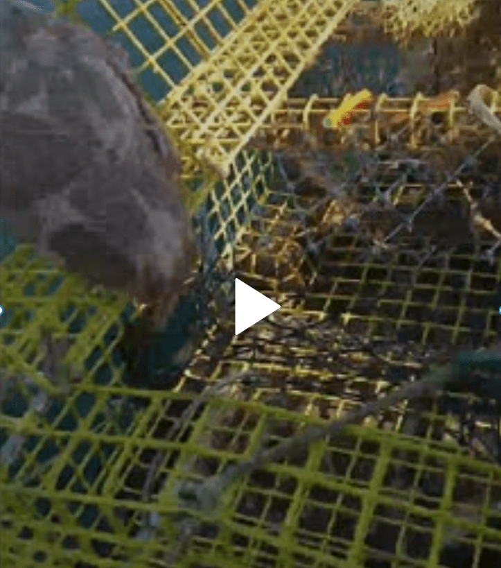 I had a pork butt that I just didn’t get a chance to put on teh smoker for pulled pork sandwiches so Captain Chris Orsillo aboard the Lobster Boat Trapper John agreed to use it for bait and report back on the results. Here it is getting put into the trap on Friday,