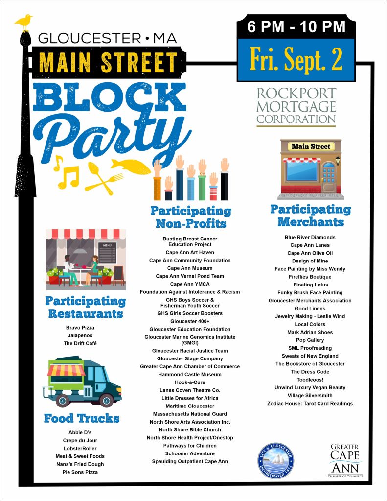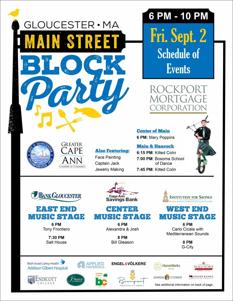 Get ready for the biggest and best Gloucester Main Street Block Party on Friday, September 2 from 6 to 10 pm! Kilted Colin, Bosoma School of Dance, Captain Jack, and Mary Poppins will be entertaining the crowds along with six musical acts on three separate stages. Six food vendors will be serving up delicious dishes along with several Main Street restaurants. Visit with your favorite non-profits and merchants, play some games, get your face painted, make some jewelry, and hold a snake or two! Guaranteed to be fun for the whole family and a great way to kick off Labor Day and Schooner Festival weekend!