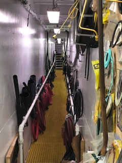A distant view of typical seiner, about 150′ long, carries a million pounds of menhaden (2 refrigerated fish holds). Boats are powered with twin 12-cylinder D399s Caterpillar main propulsion. On deck, under deck house, are four smaller CATS used for refrigeration and hydraulics. (all facilities are air conditioned.)Yours truly, in pilot house of F/V Smuggler’s Point; we toured, this past SaturdayAlleyway from engine room stern to bow, between refrigerated fish holds, (each carrying 500,000 lbs.).Tidelands, Reedville, VA, a fish carrier only, refrigerated capacity – 2 million lbs.Take-out wharf scene. This is a big operation with approx. 15 operating seiners.