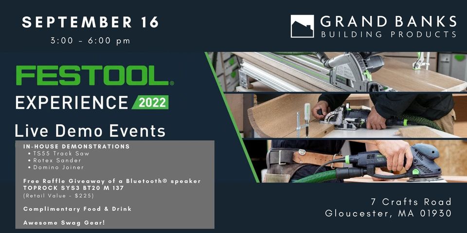 TheFestoolExperience Tour is coming to Grand BanksFriday, September 16th. A few of Festool’s best will be demonstrated live, including the TS 55 Track Saw, the Rotex Sander, and the Domino Joiner.