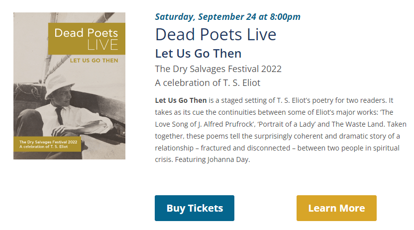 | Dead Poets Live at Gloucester StageThe Dry Salvages Festival 2022 A celebration of T. S. Eliot Dead Poets Live is a staged setting of T. S. Eliot’s poetry for two readers. Featuring: Johanna Day and Malcolm Ingram. |