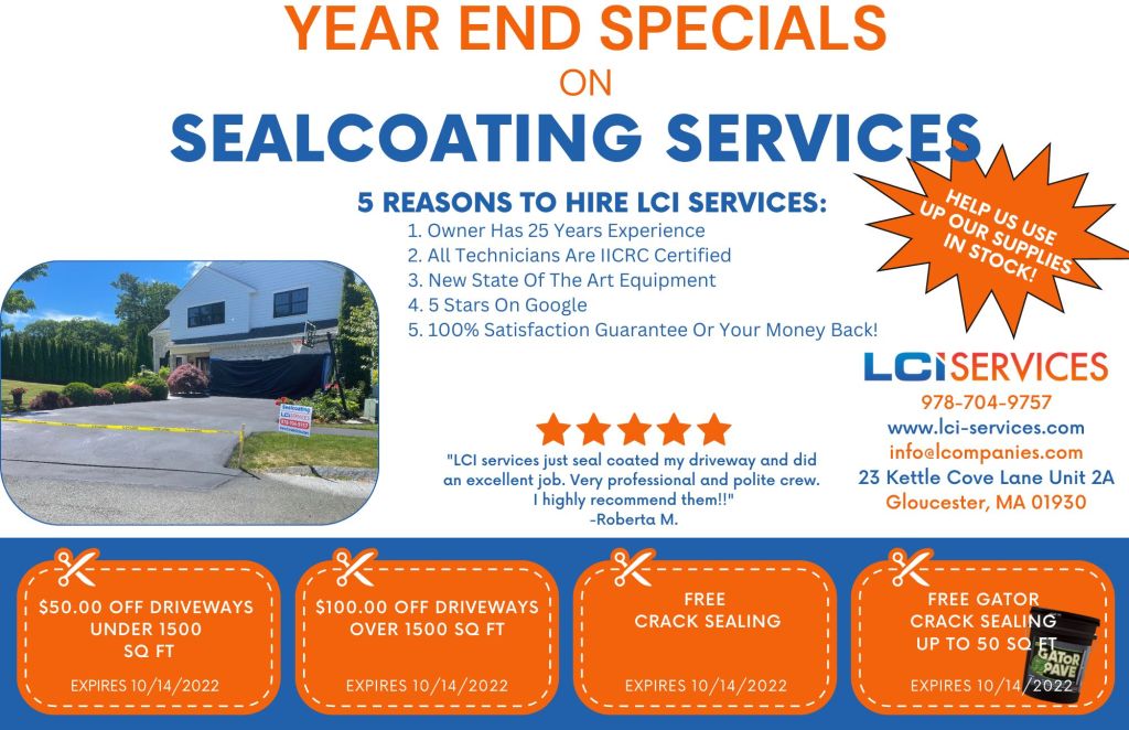 Last week of the season to schedule your driveway sealing, take advantage of these money saving offers. If you would like to put your name onto the list for next season, give the office a call. All estimates are free, 978-704-9757
