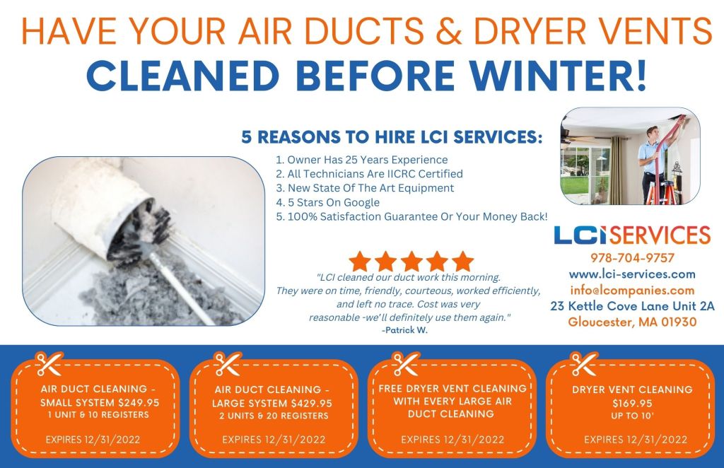 Call LCI Services today to schedule your dryer vent cleaning! Check out these money saving offers! 978-704-9757